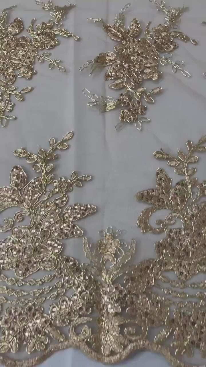 Flower Lace Sequins Fabric - Metallic Gold - Embroidery Floral Design Lace Fabric By Yard