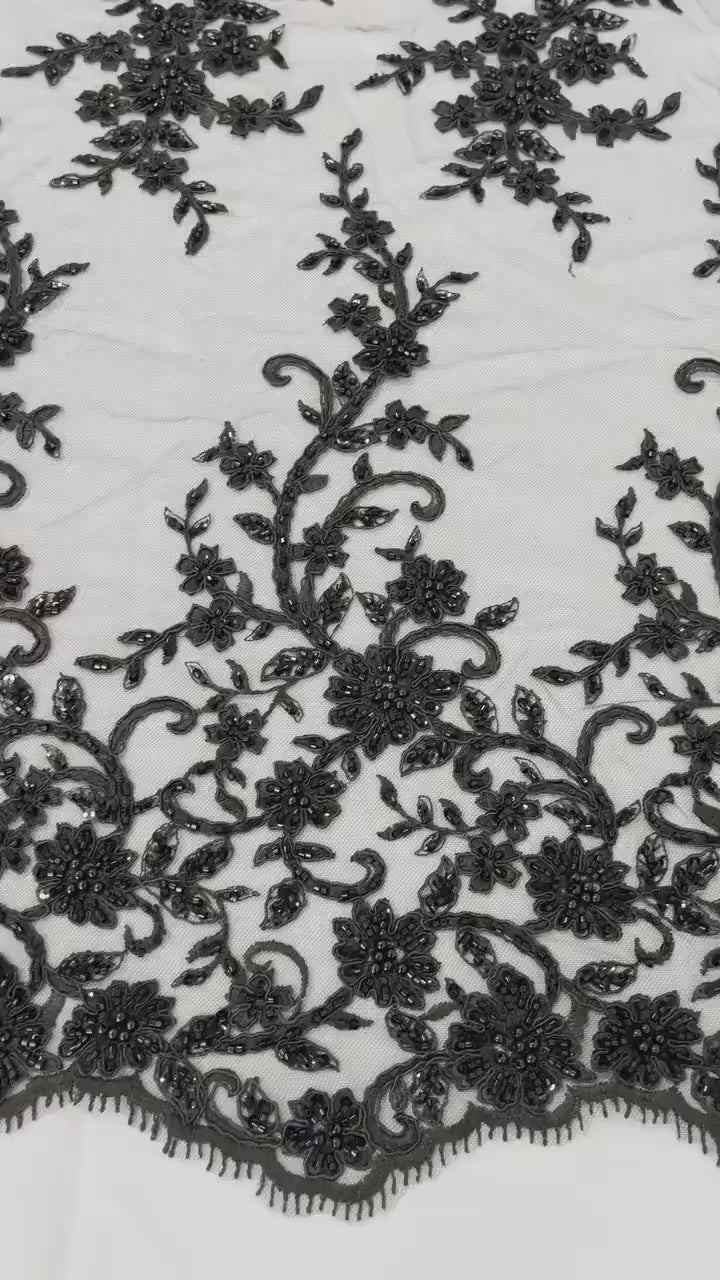 Floral Long Border Bead Fabric - Black - Embroidered Floral Cluster Design Fabric By Yard