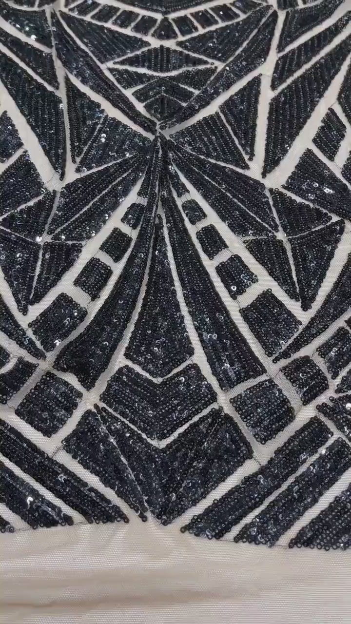 Geometric Triangle Lines Sequins - Black on Nude - 4 Way Stretch Geometric Design Sequins By Yard