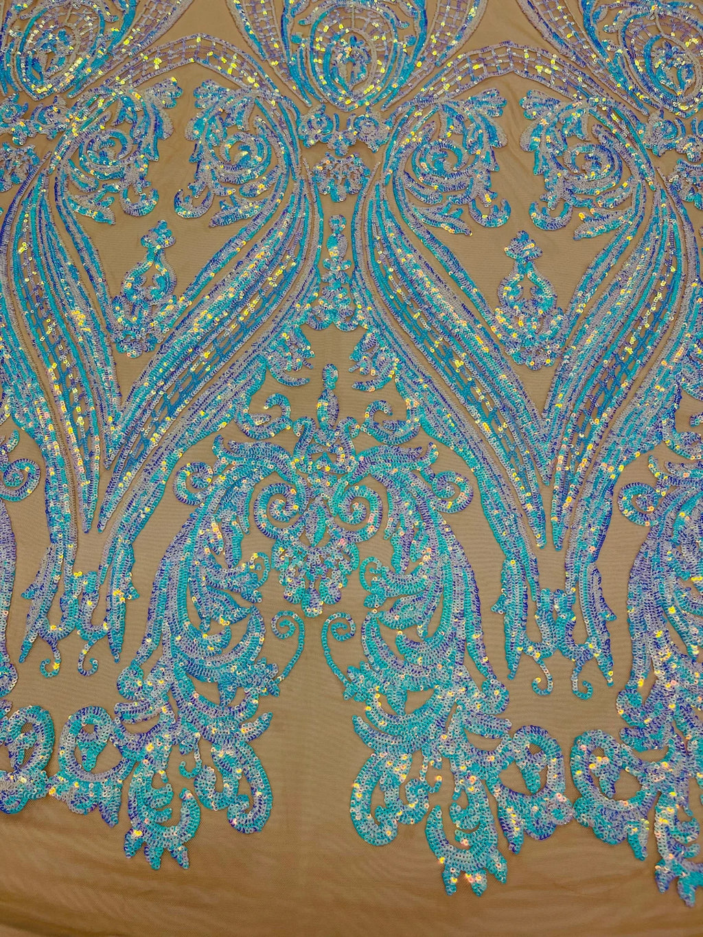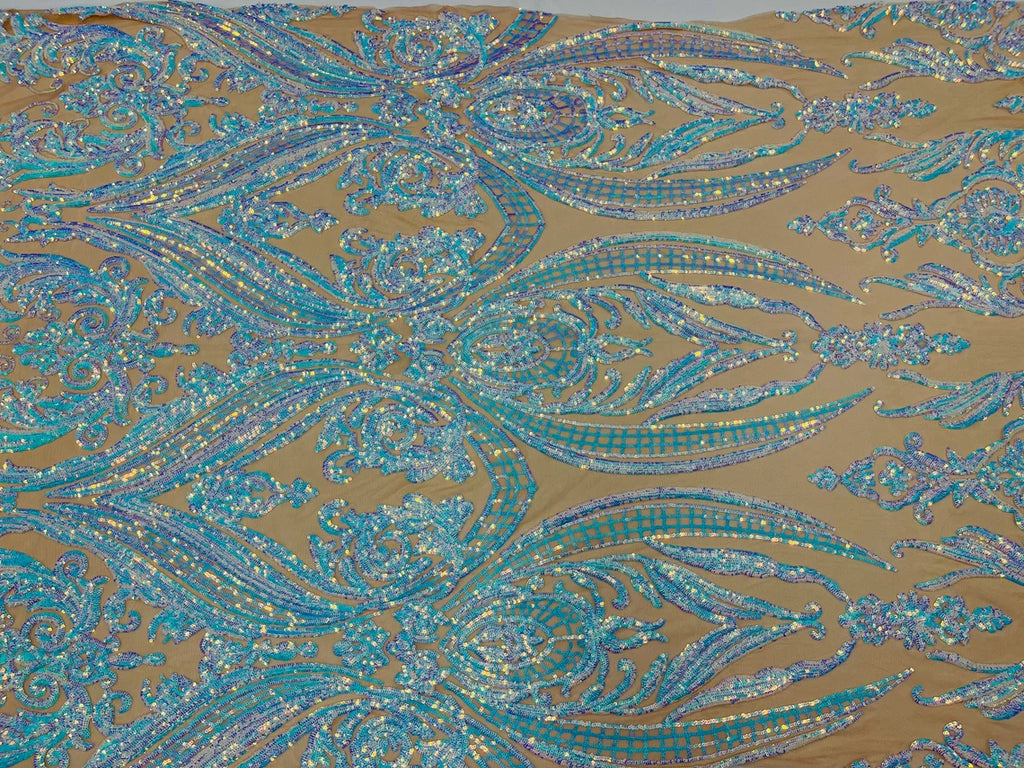 Big Damask 4 Way Sequins - Iridescent Aqua Blue on Dark Nude - Embroidered Damask Design Sequins Fabric Sold By Yard