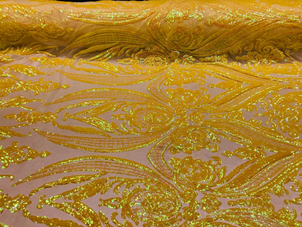 Big Damask 4 Way Sequins - Iridescent Yellow on Yellow - Embroidered Damask Design Sequins Fabric Sold By Yard