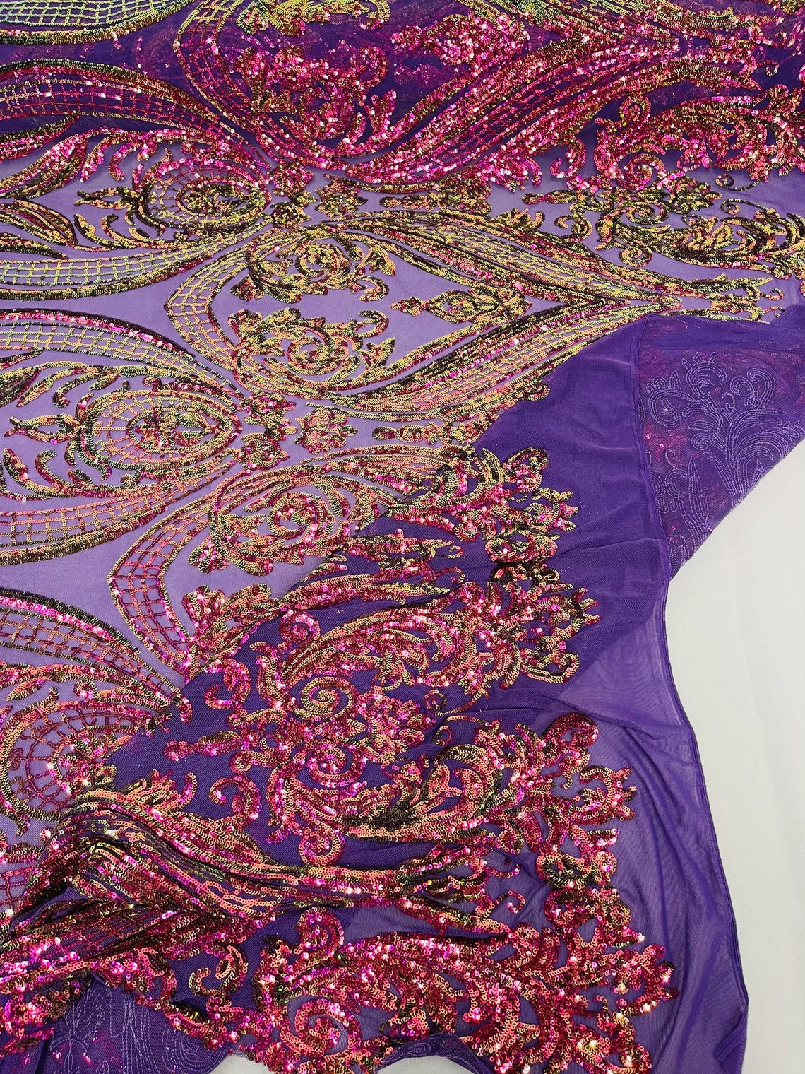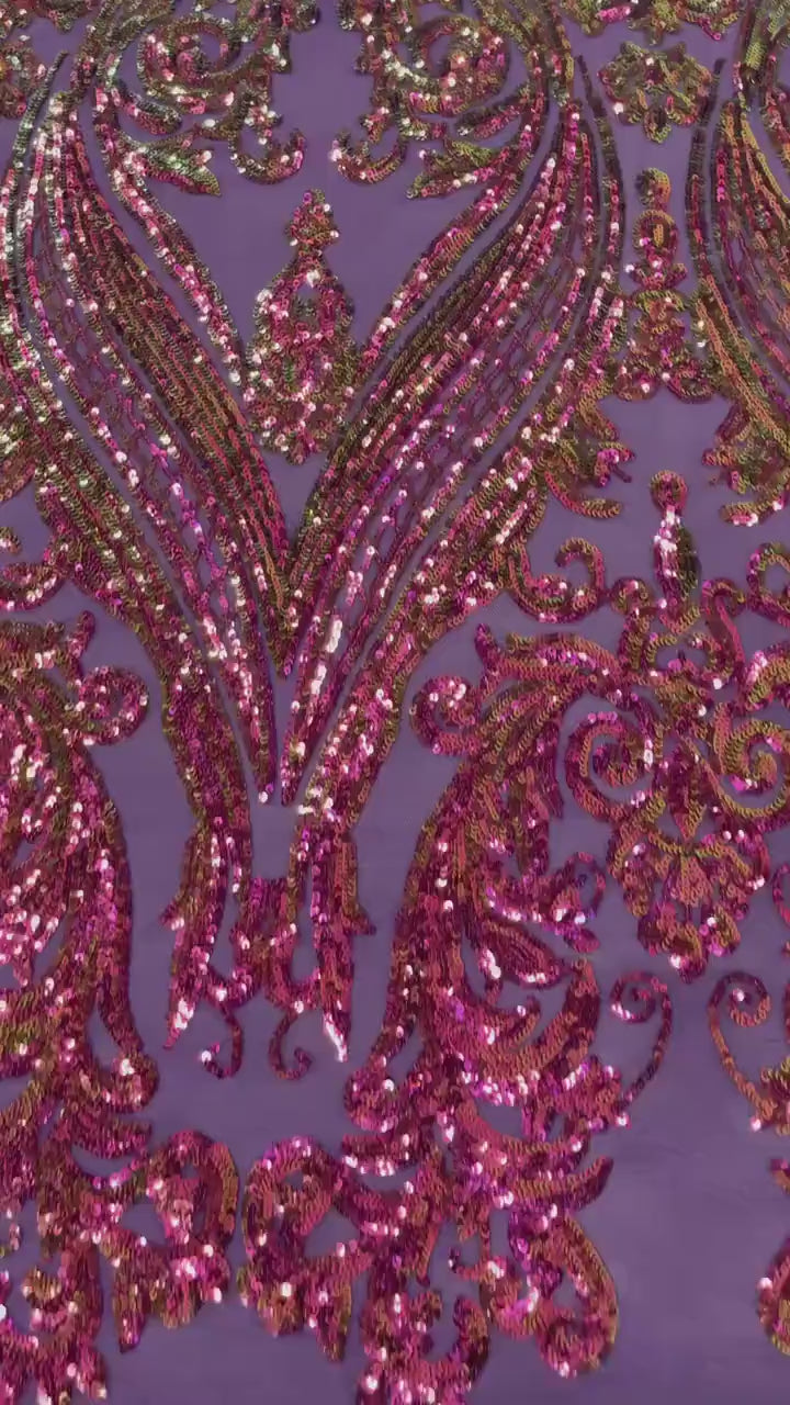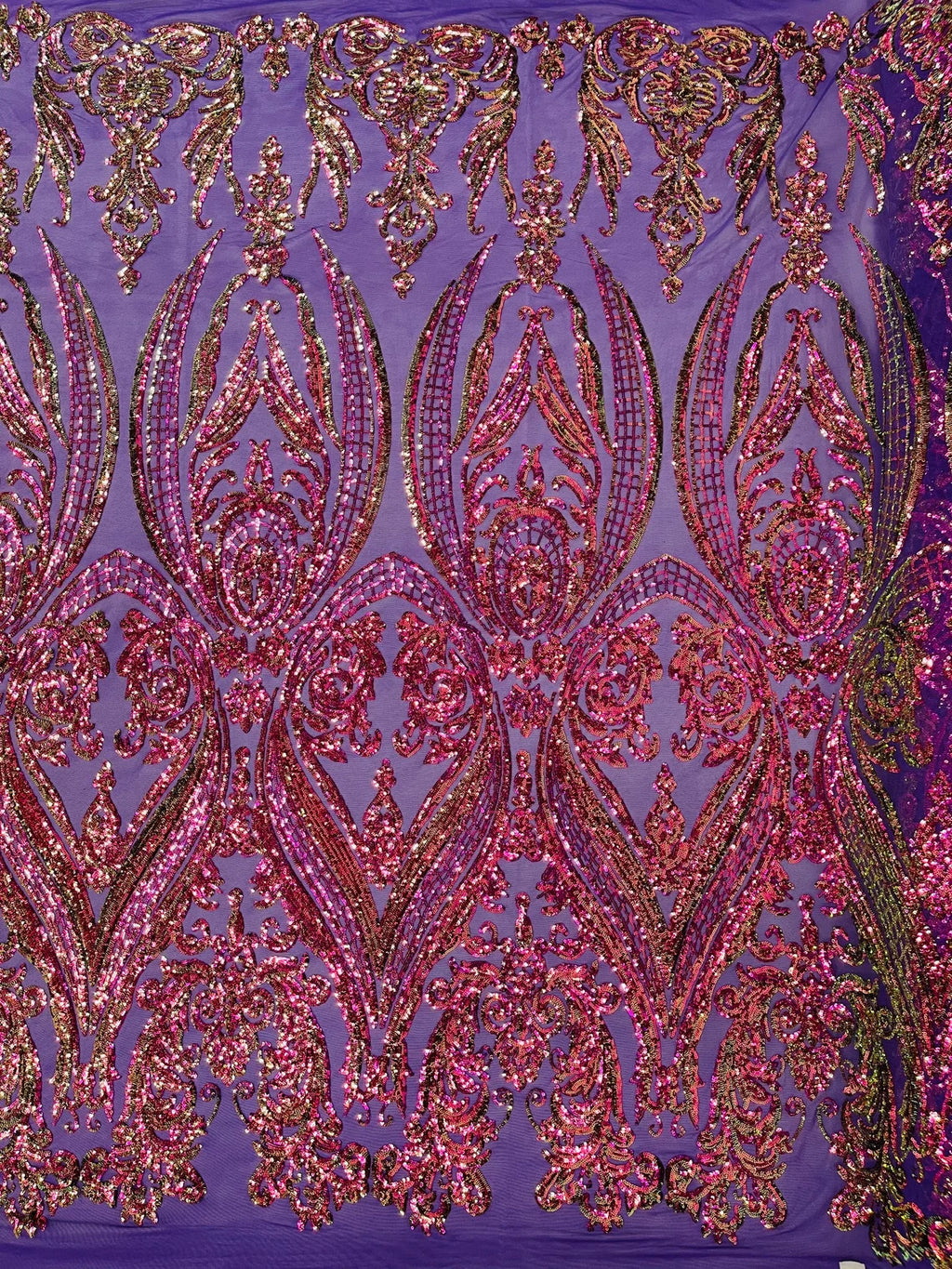 Big Damask 4 Way Sequins - Purple Iridescent - Embroidered Damask Design Sequins Fabric Sold By Yard