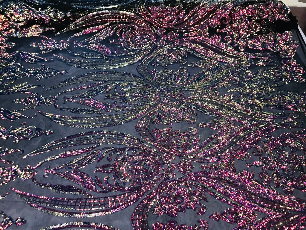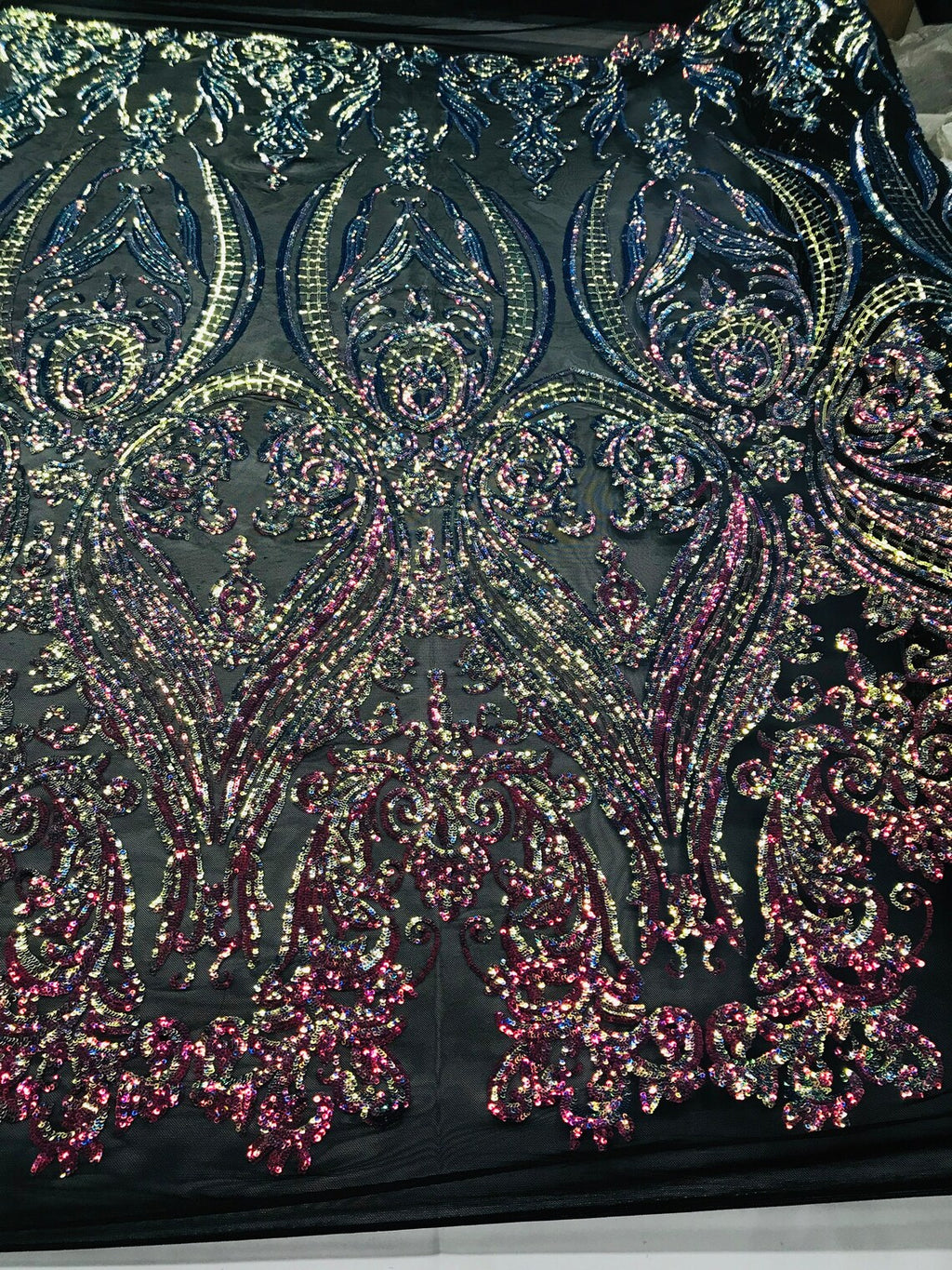 Big Damask 4 Way Sequins - Rainbow Iridescent - Embroidered Damask Design Sequins Fabric Sold By Yard