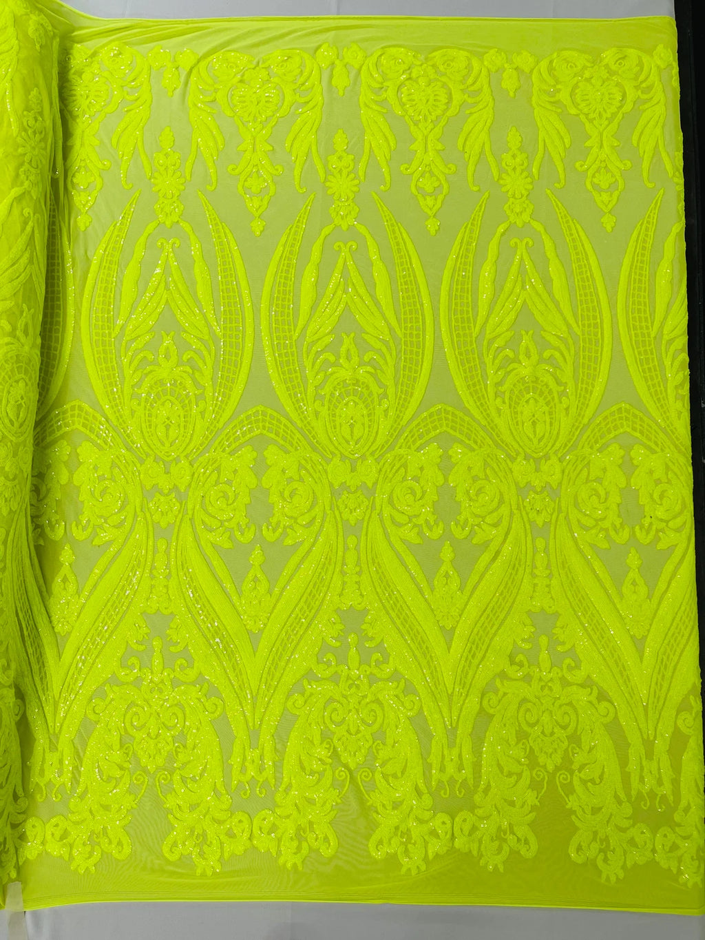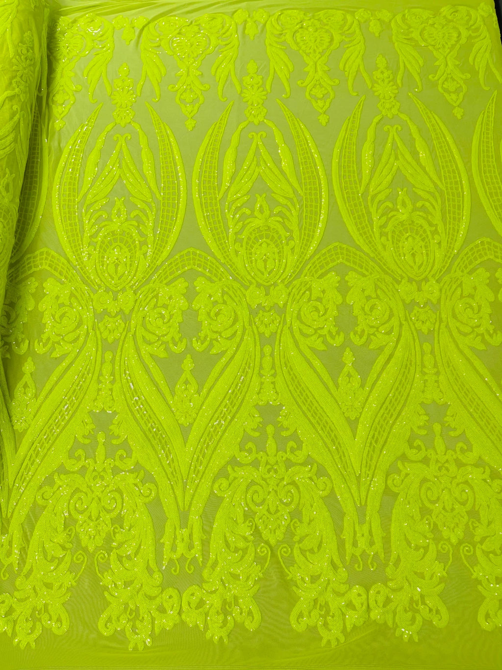 Big Damask 4 Way Sequins - Solid Neon Yellow - Embroidered Damask Design Sequins Fabric Sold By Yard