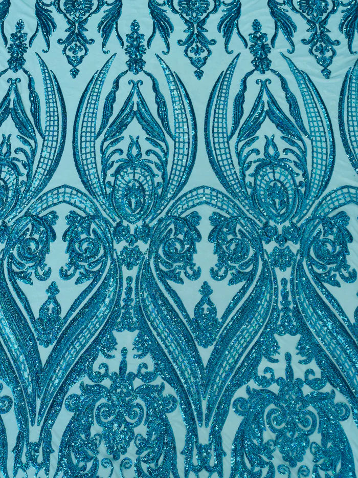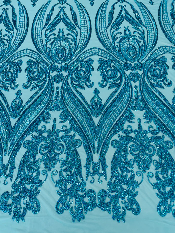 Big Damask 4 Way Sequins - Turquoise - Embroidered Damask Design Sequins Fabric Sold By Yard