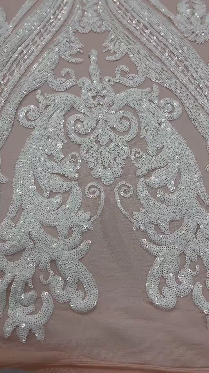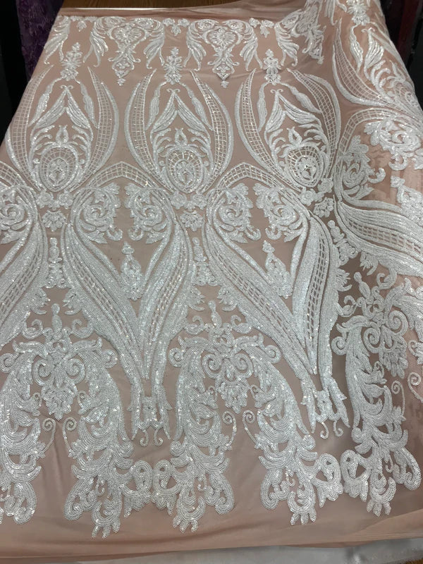 Big Damask 4 Way Sequins - White on Blush - Embroidered Damask Design Sequins Fabric Sold By Yard
