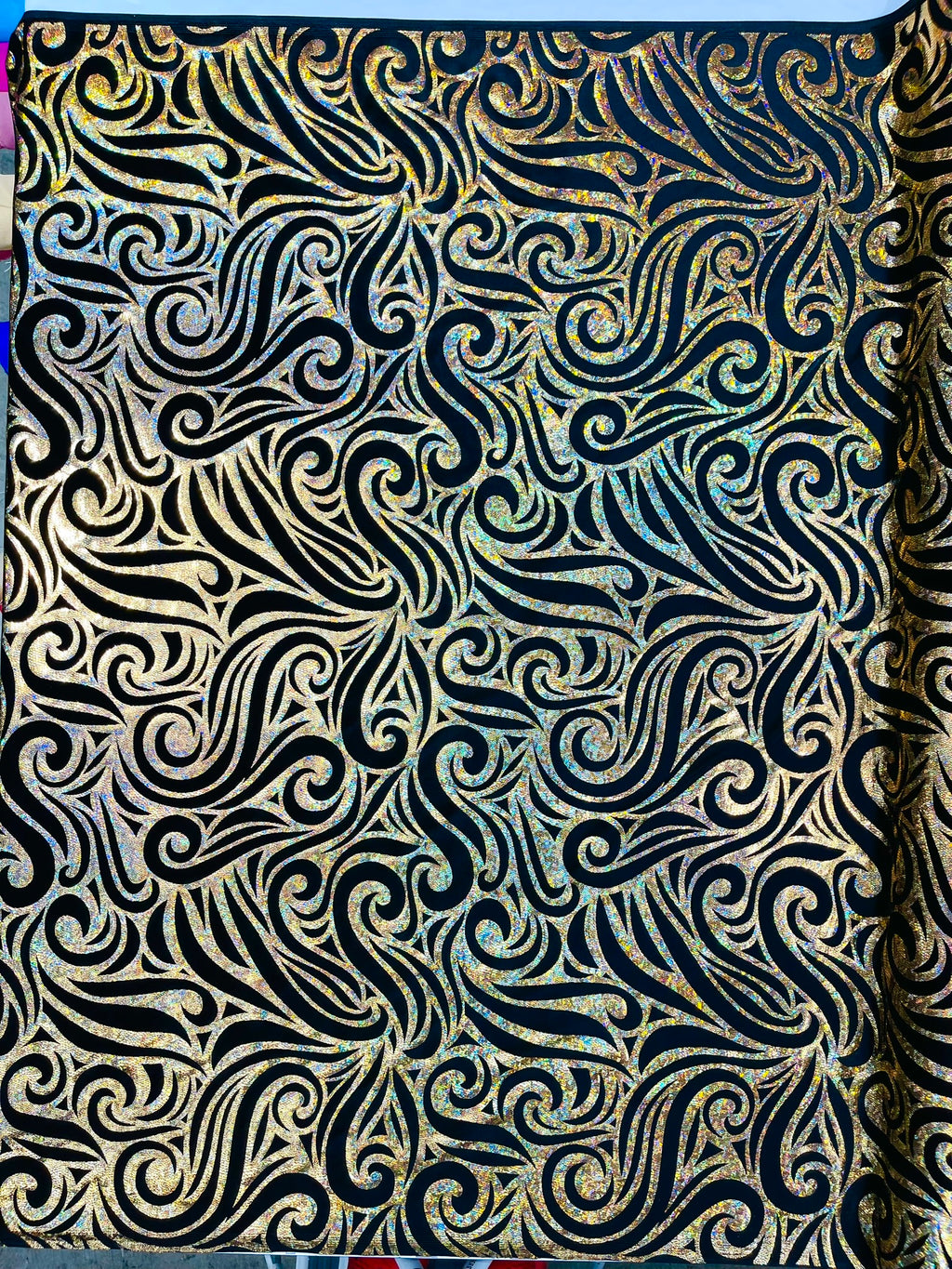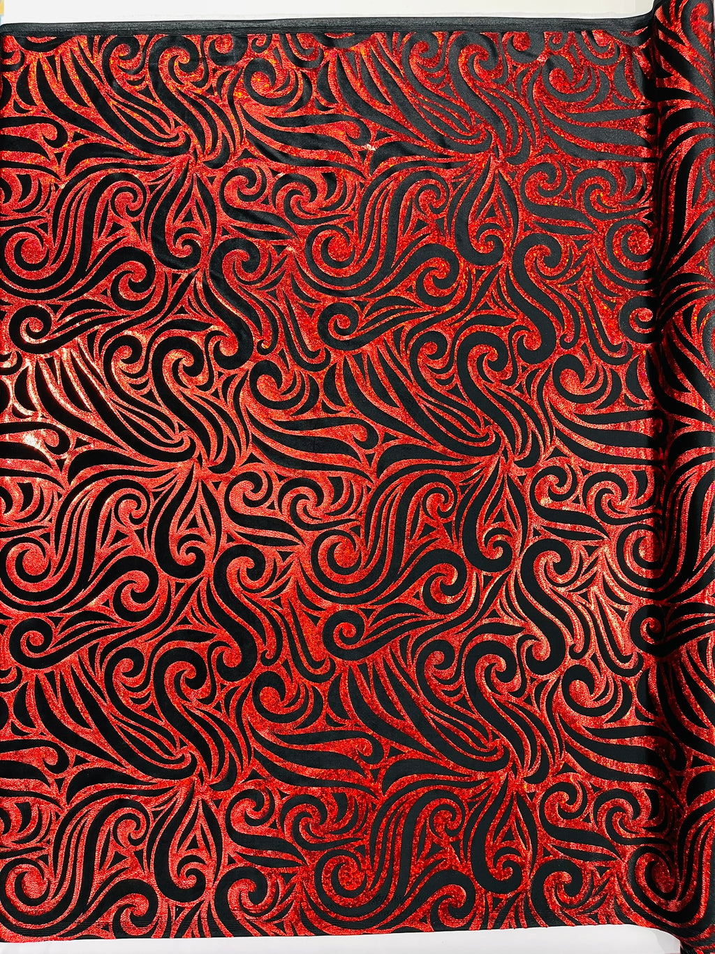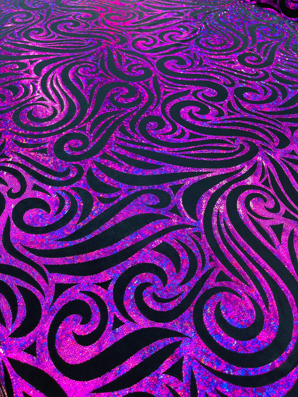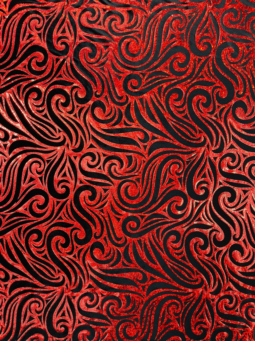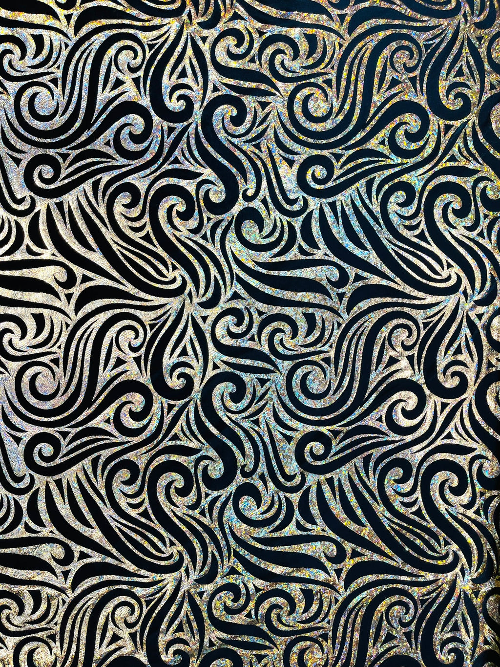 Our Tribal Flame Design Velvet Fabric has an holographic lame Flame print on stretch Velvet fabric. Item has a 5 % stretch on the grain and has a 3% stretch vertical.