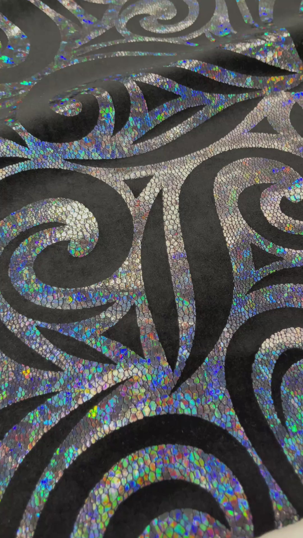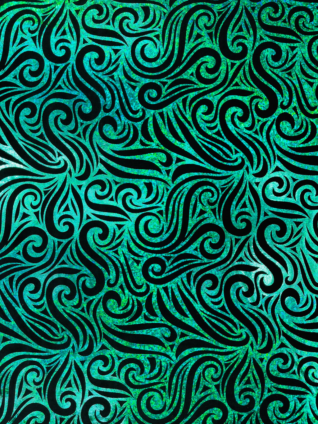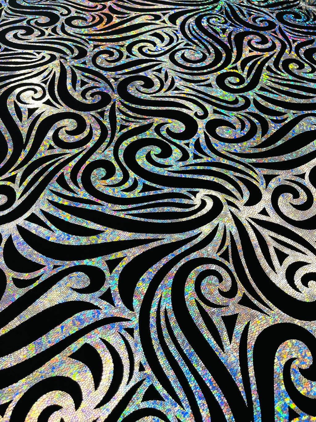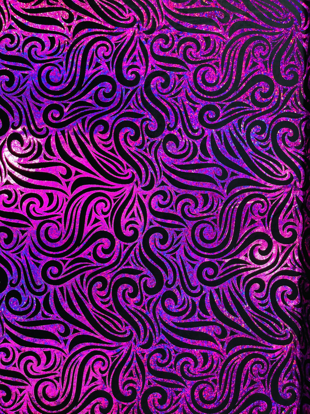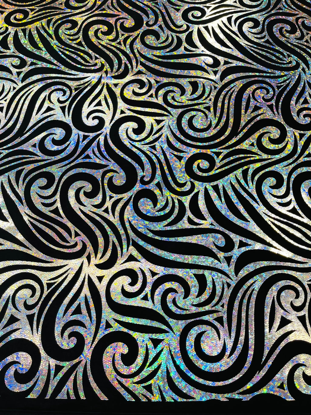 Our Tribal Flame Design Velvet Fabric has an holographic lame Flame print on stretch Velvet fabric. Item has a 5 % stretch on the grain and has a 3% stretch vertical.