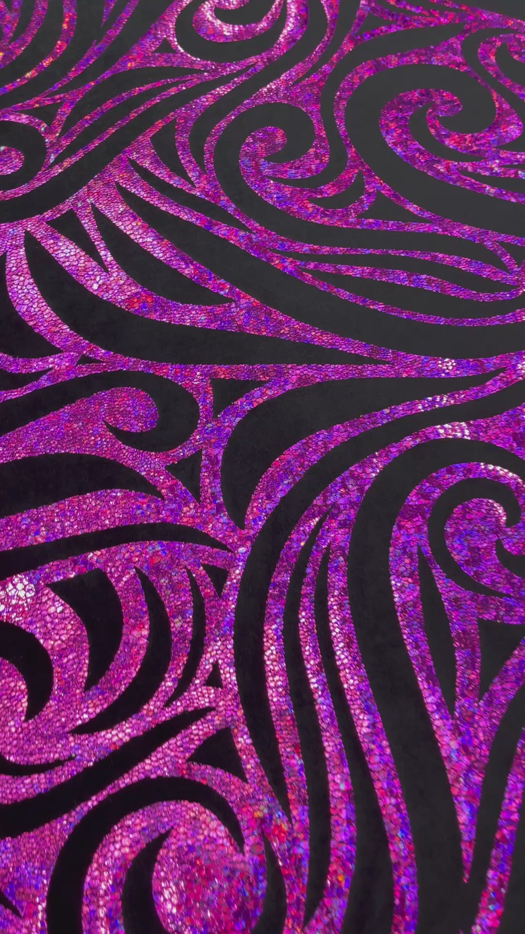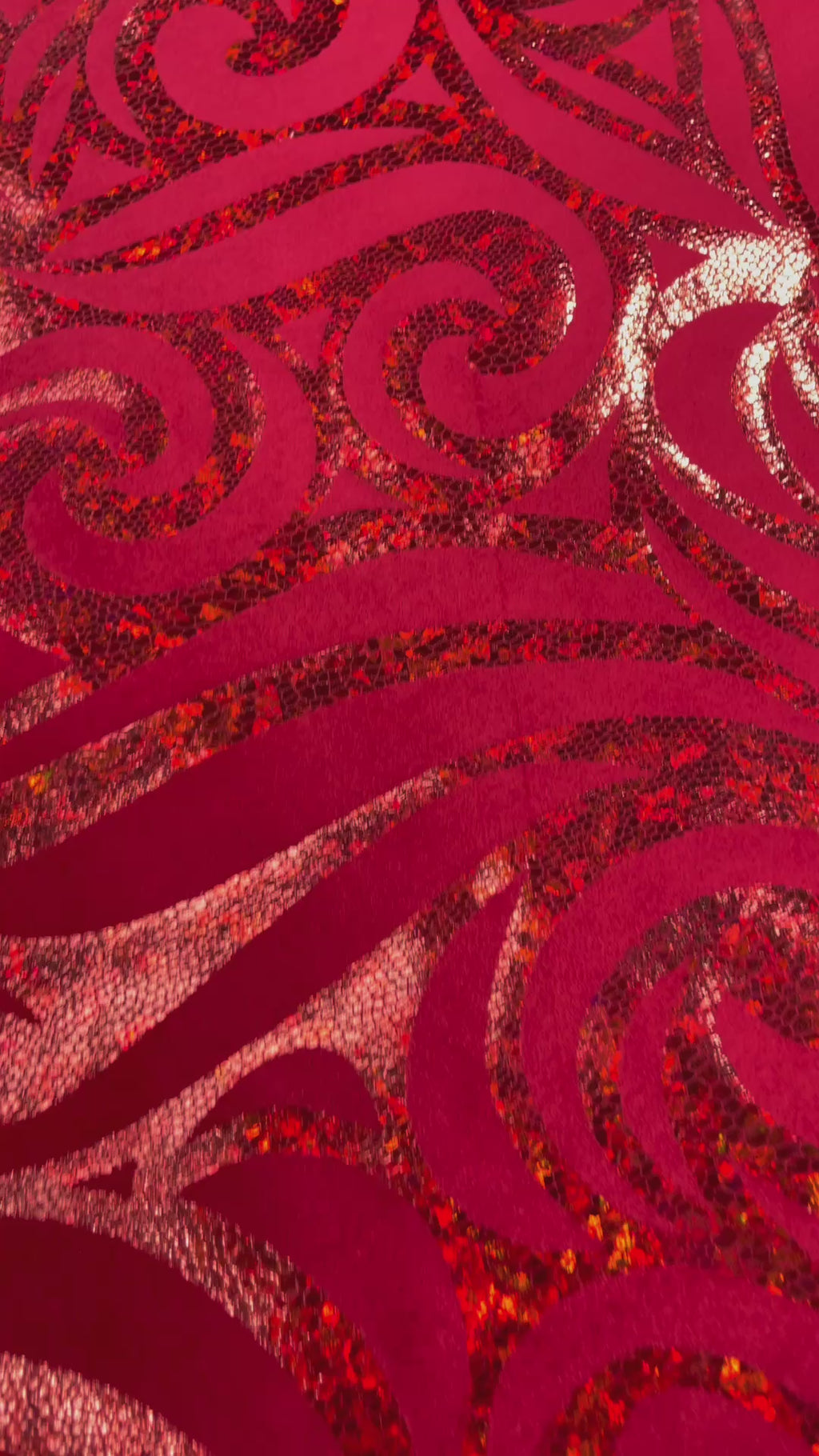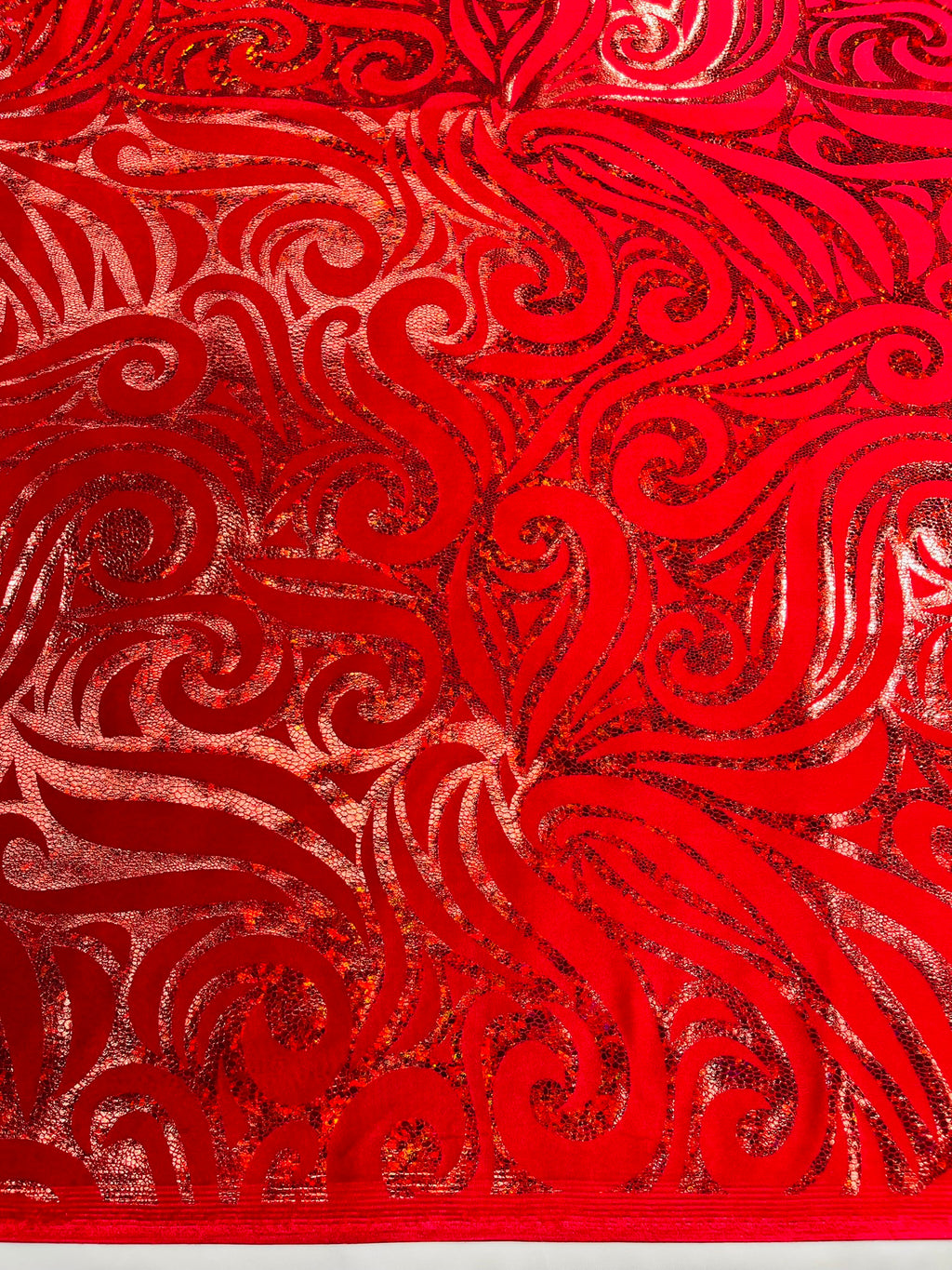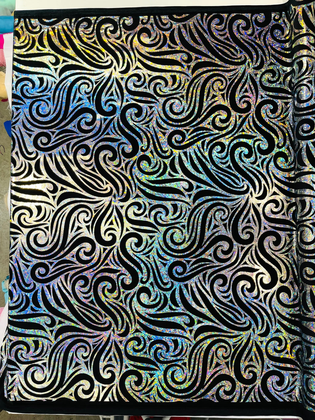 Our Tribal Flame Design Velvet Fabric has an holographic lame Flame print on stretch Velvet fabric. Item has a 5 % stretch on the grain and has a 3% stretch vertical.