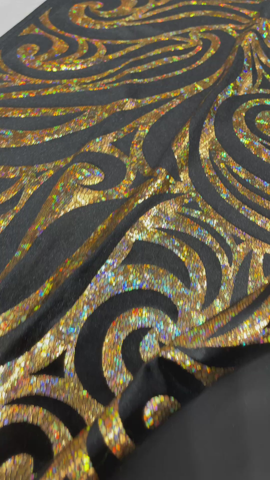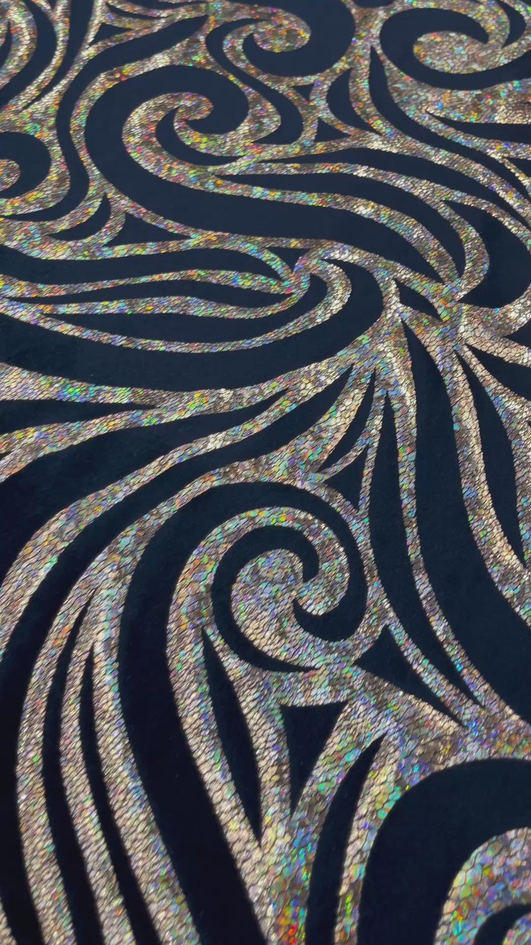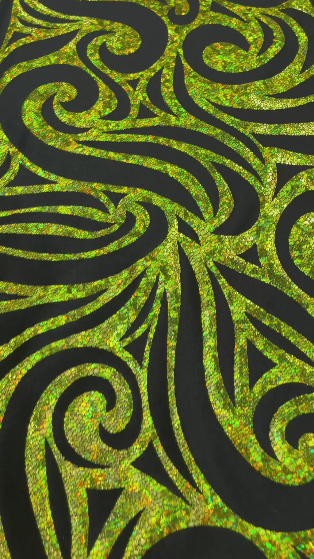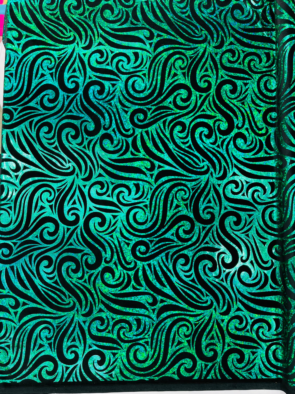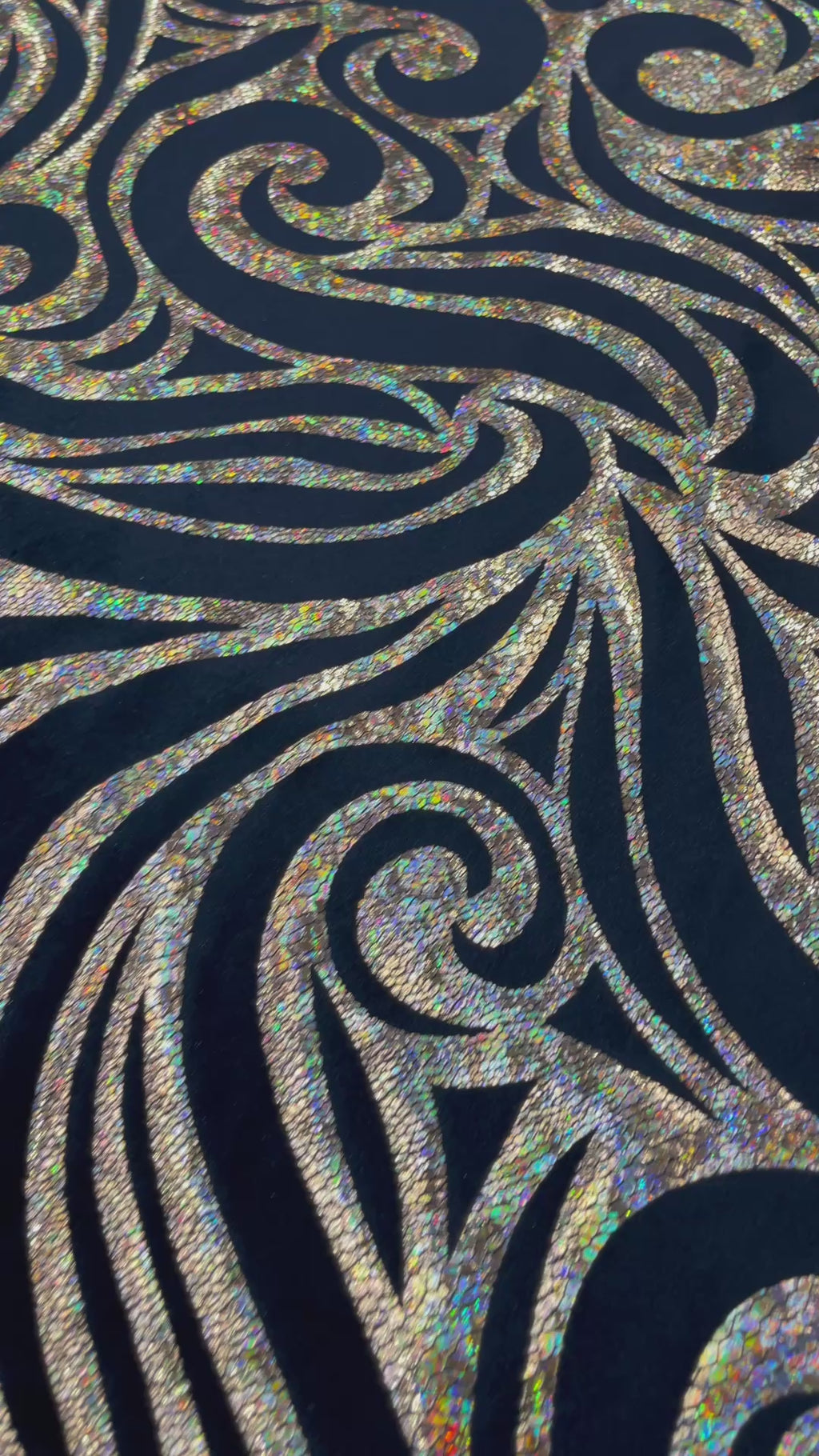 Our Tribal Flame Design Velvet Fabric has an holographic lame Flame print on stretch Velvet fabric. Item has a 5 % stretch on the grain and has a 3% stretch vertical.