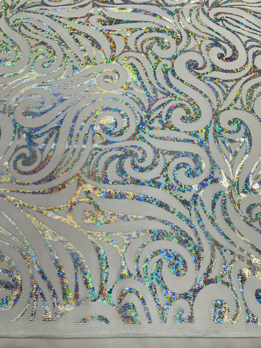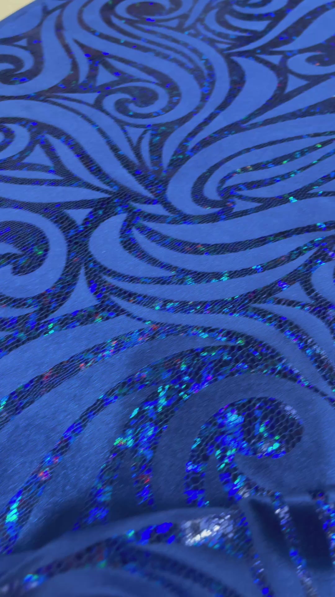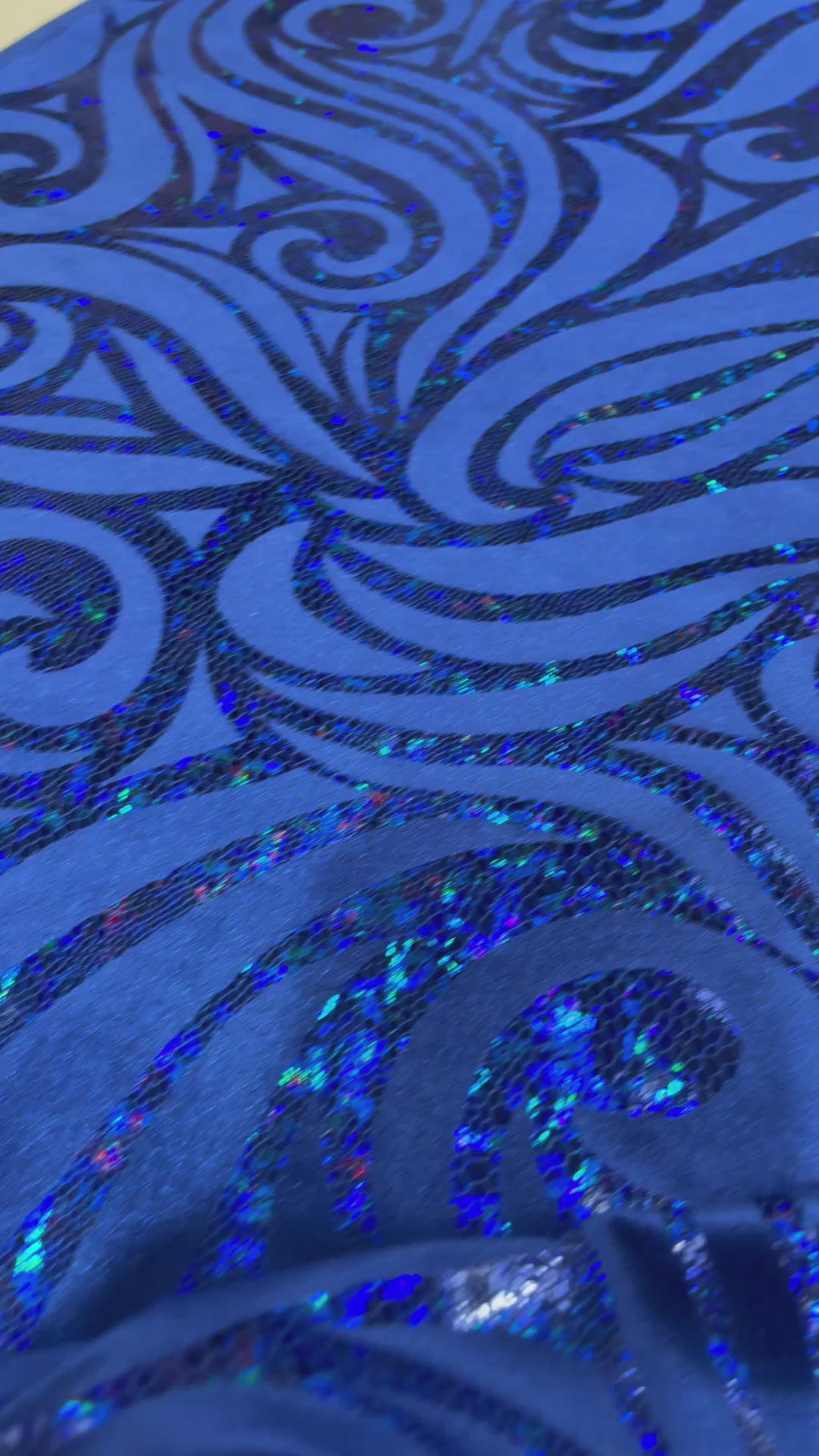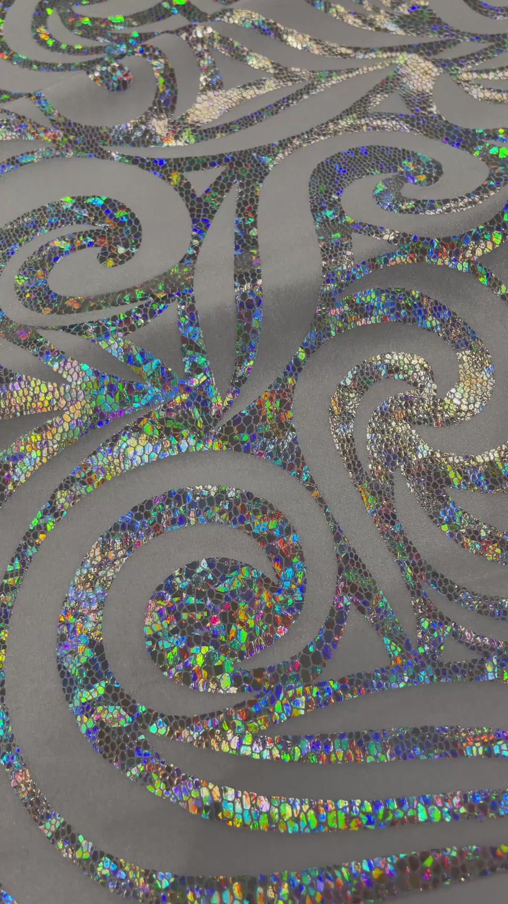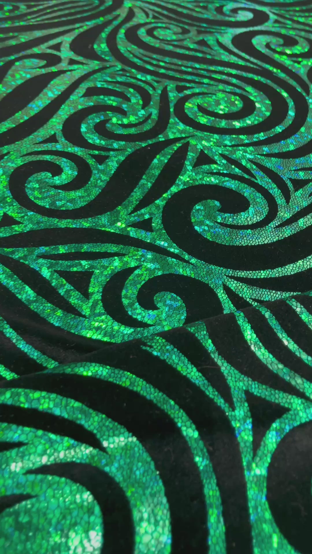 Our Tribal Flame Design Velvet Fabric has an holographic lame Flame print on stretch Velvet fabric. Item has a 5 % stretch on the grain and has a 3% stretch vertical.
