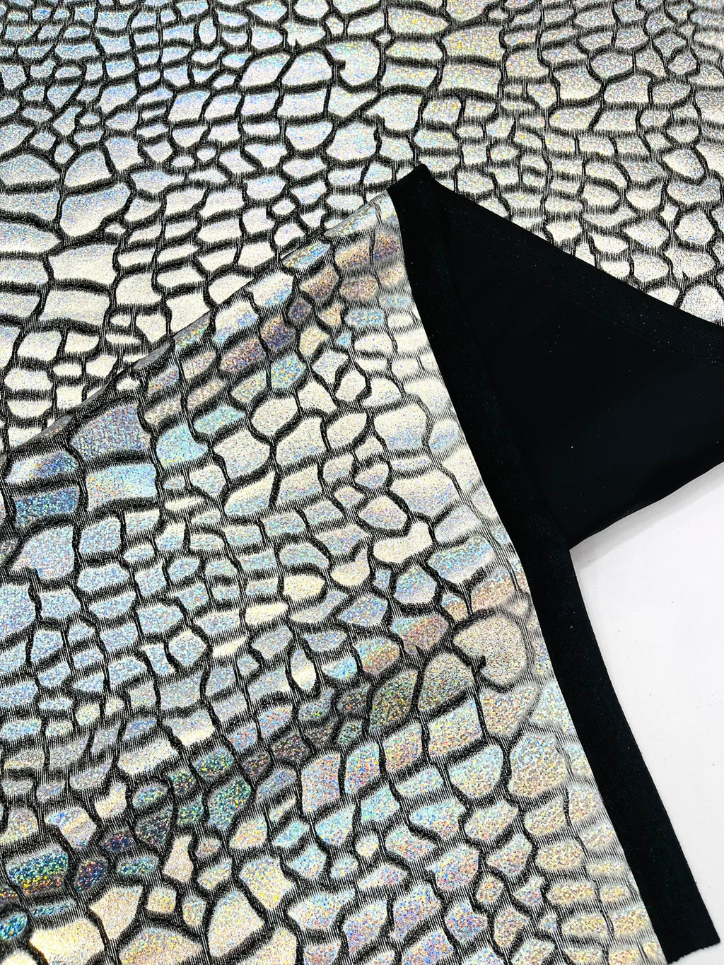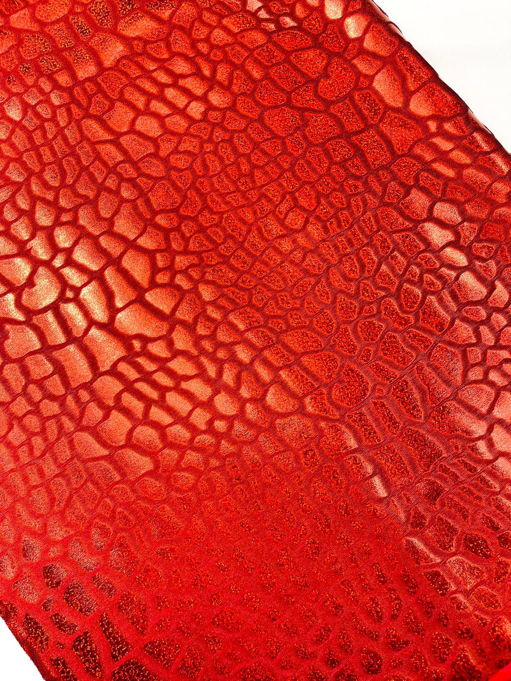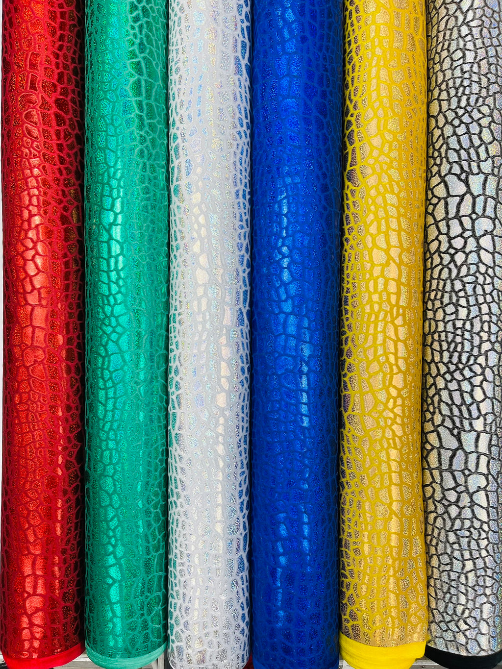 Our Dragon Skin Spandex Fabric has an iridescent lame snake print on stretch velvet fabric. Item has a 5 % stretch on the grain and has a 3% stretch vertical. If more than one yard is purchased, item will come in one piece. For instance, if you order one yard, you will receive a piece of 58” x 36”. If you order two yards, you will receive a piece of 58” x 72”, etc.