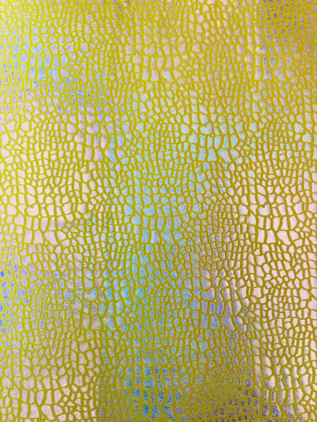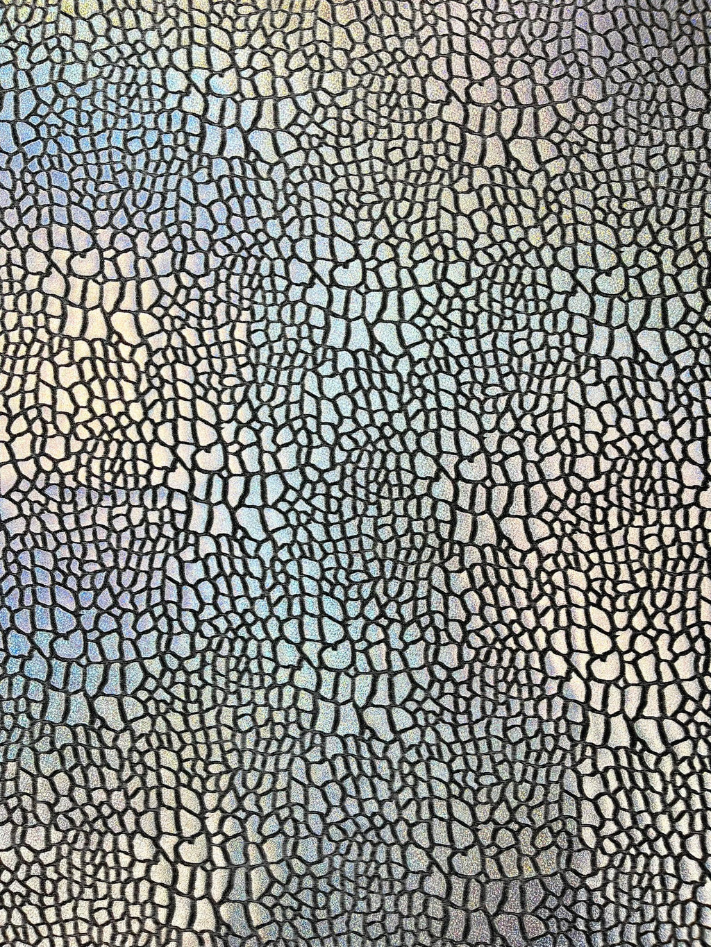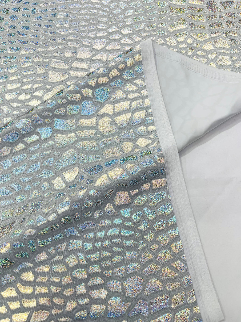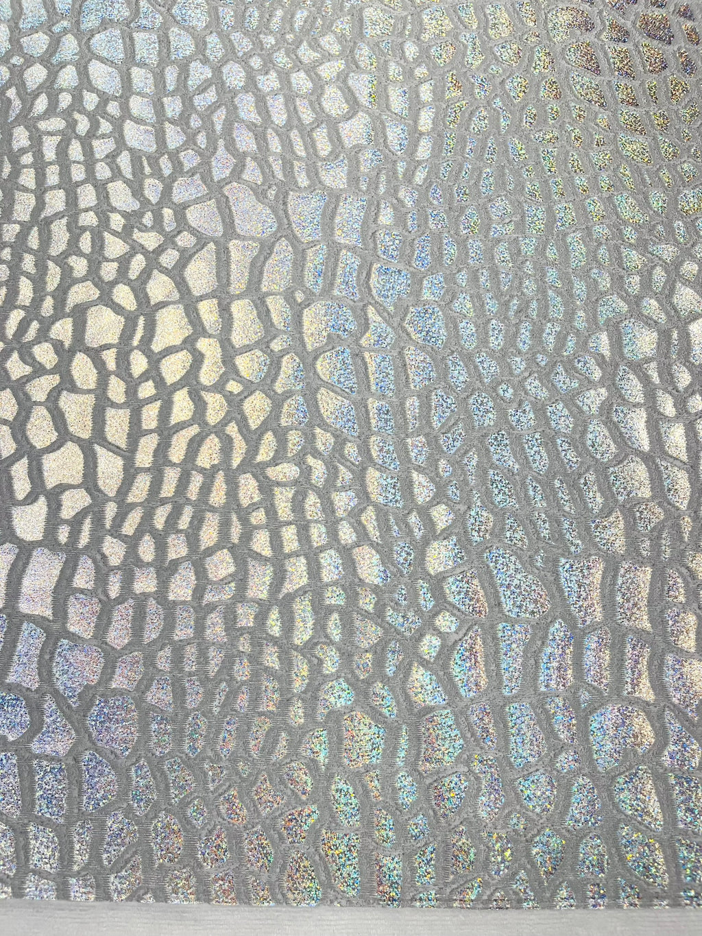 Our Dragon Skin Spandex Fabric has an iridescent lame snake print on stretch velvet fabric. Item has a 5 % stretch on the grain and has a 3% stretch vertical. If more than one yard is purchased, item will come in one piece. For instance, if you order one yard, you will receive a piece of 58” x 36”. If you order two yards, you will receive a piece of 58” x 72”, etc.