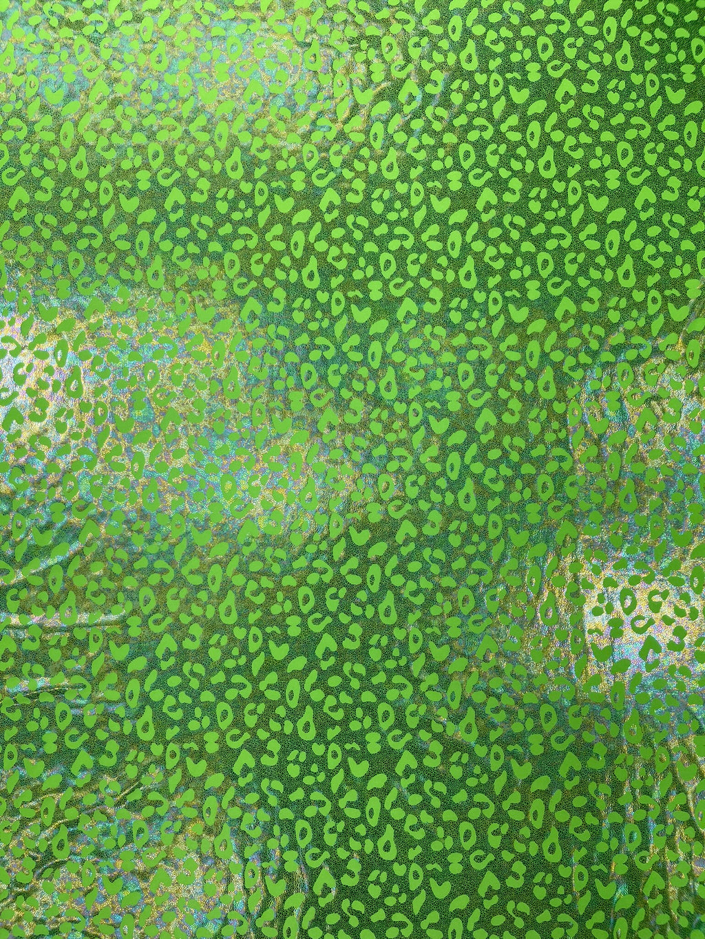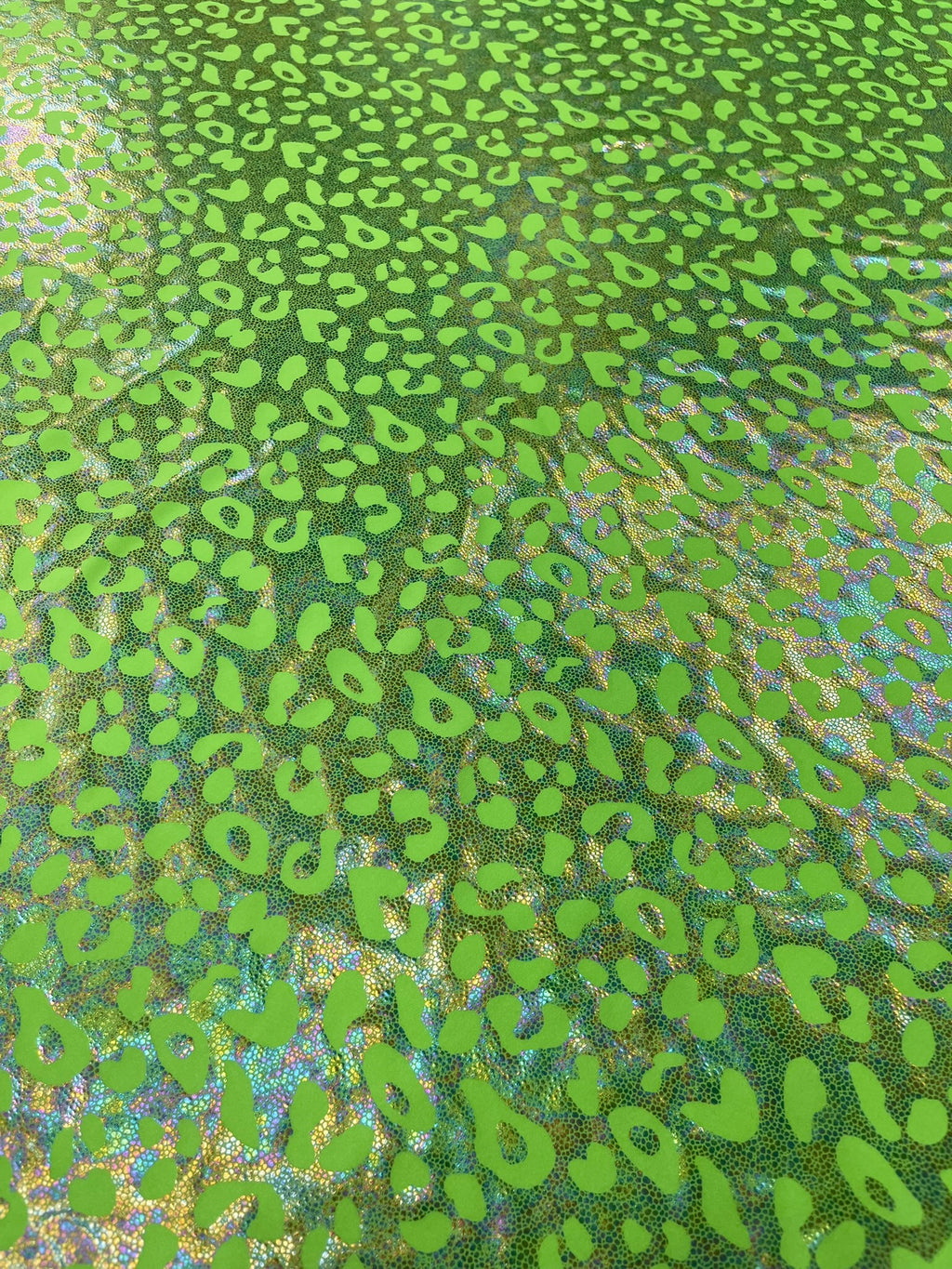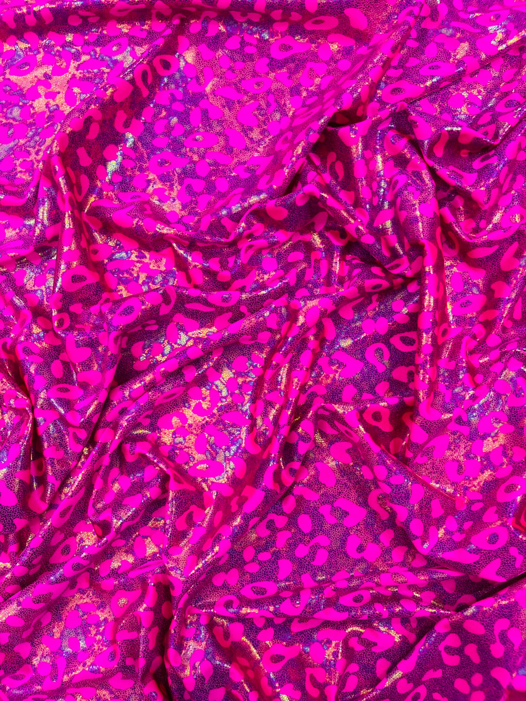 This leopard stretch fabric is 80% Nylon and 20% Spandex with a black stretch milliskin . It features a reflective and shimmering leopard print. This leopard print are Ideal for costumes, dresses, leggings, clothing, nightgowns, prom dresses, swim suits, interior décor and much more..
