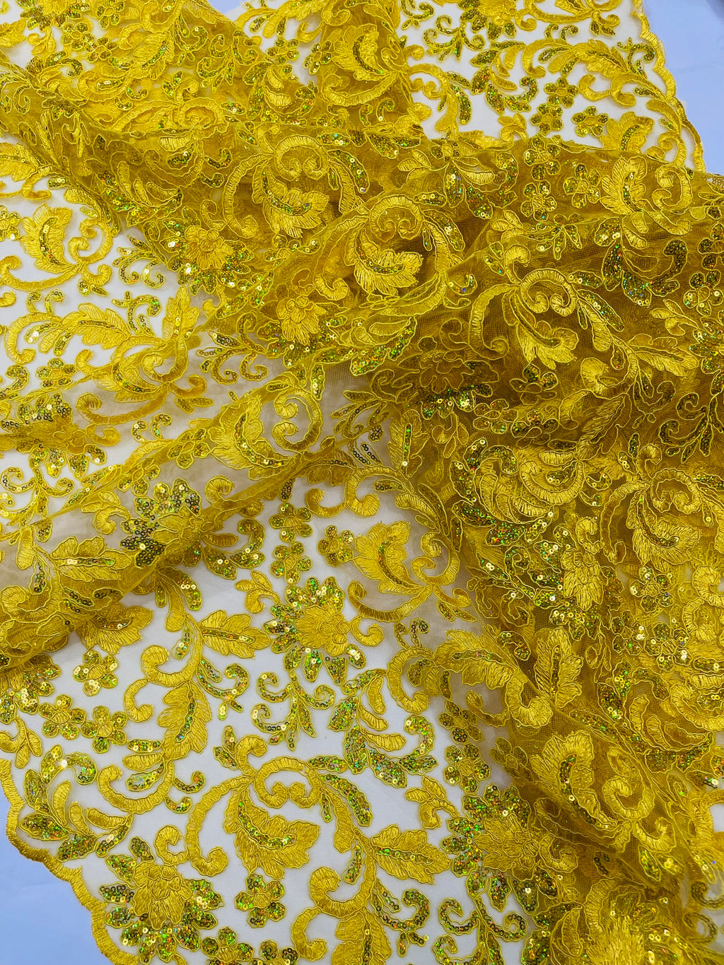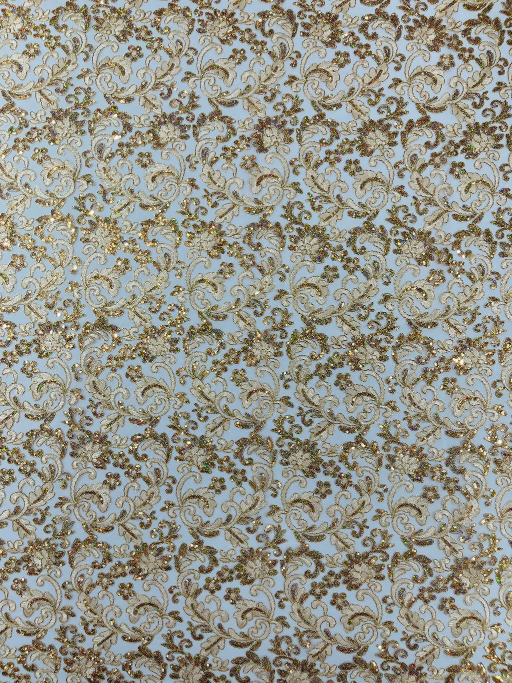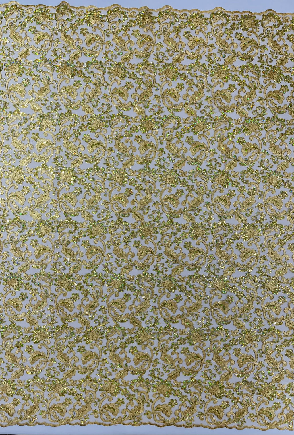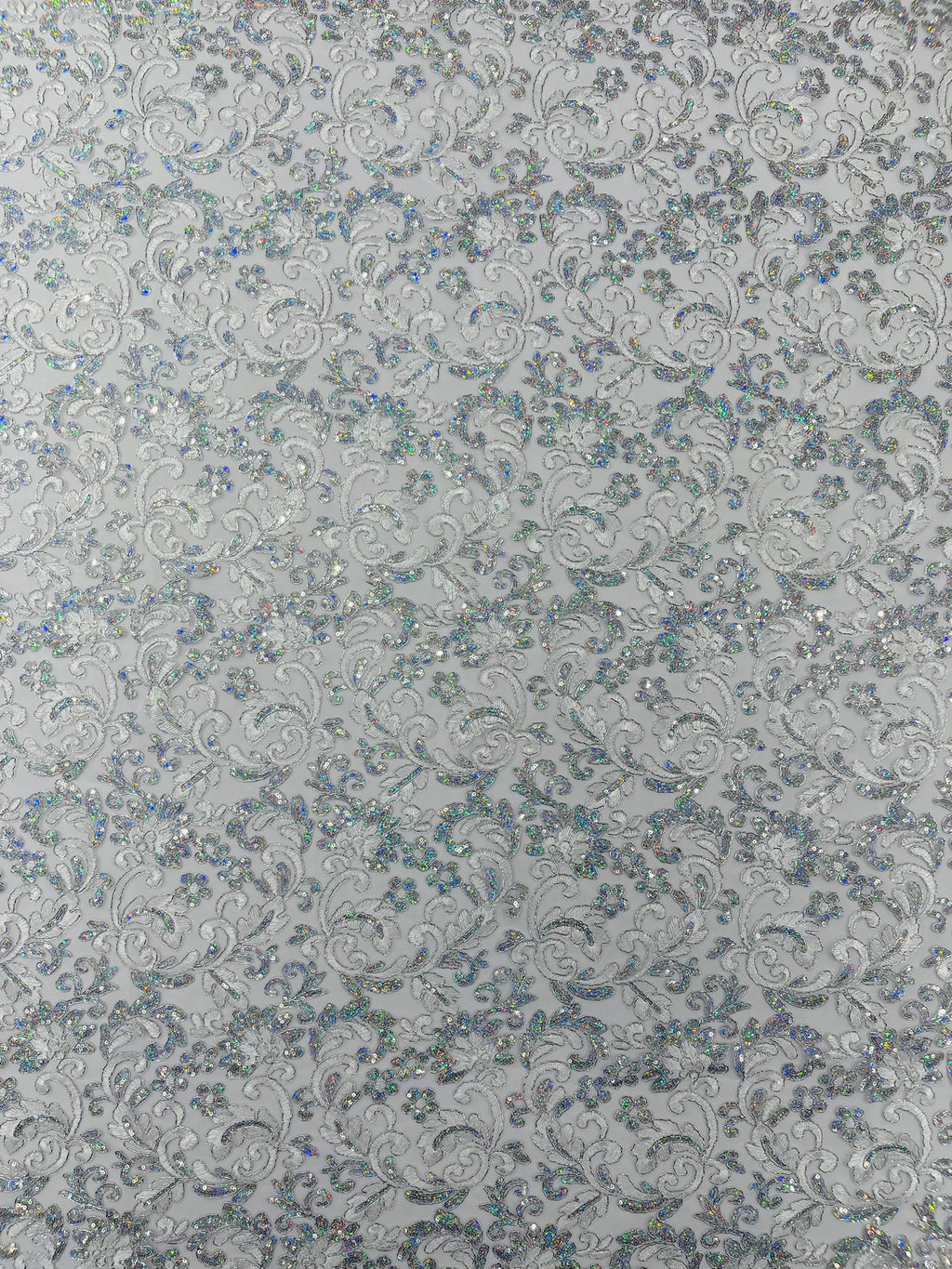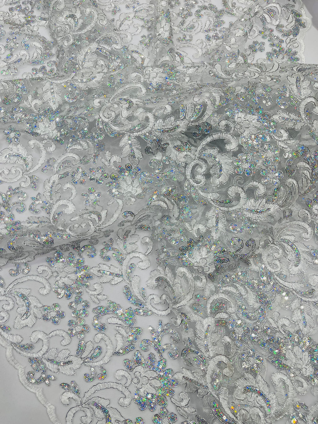 These metallic corded flowers are embroider with holographic sequins on a mesh lace fabric giving off a sophisticated and elegant look . The lace has a double scallops on the width. This lace can be used for dresses, tablecloths, nightgowns, prom gowns, bridal gowns, wedding gowns, runners, Vegas shows, pillows, decoration, and much more.