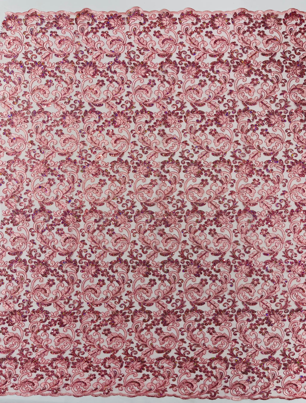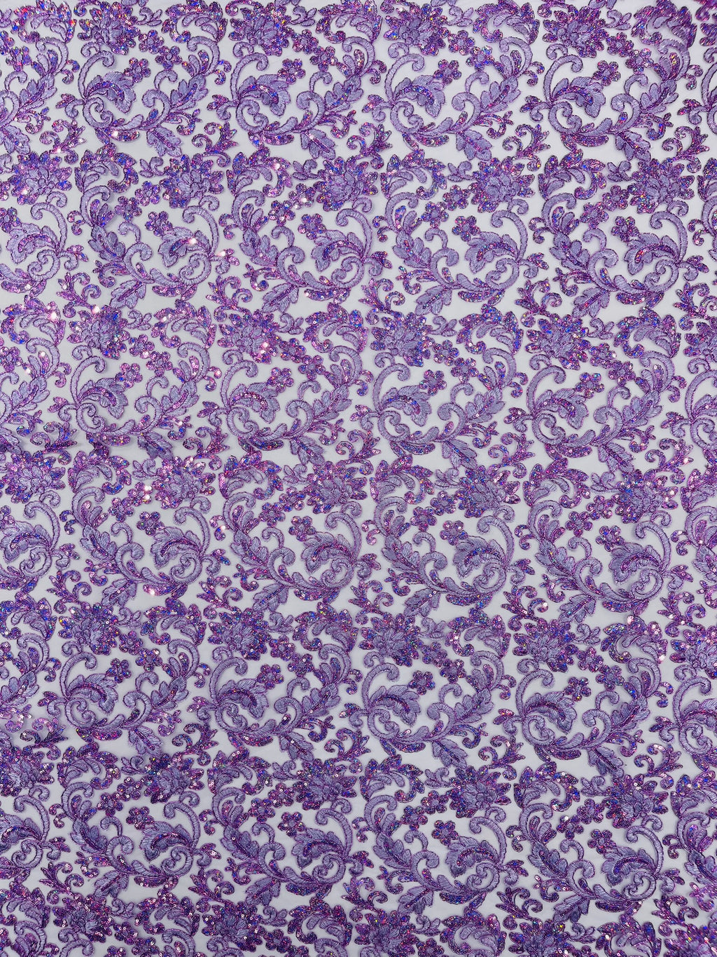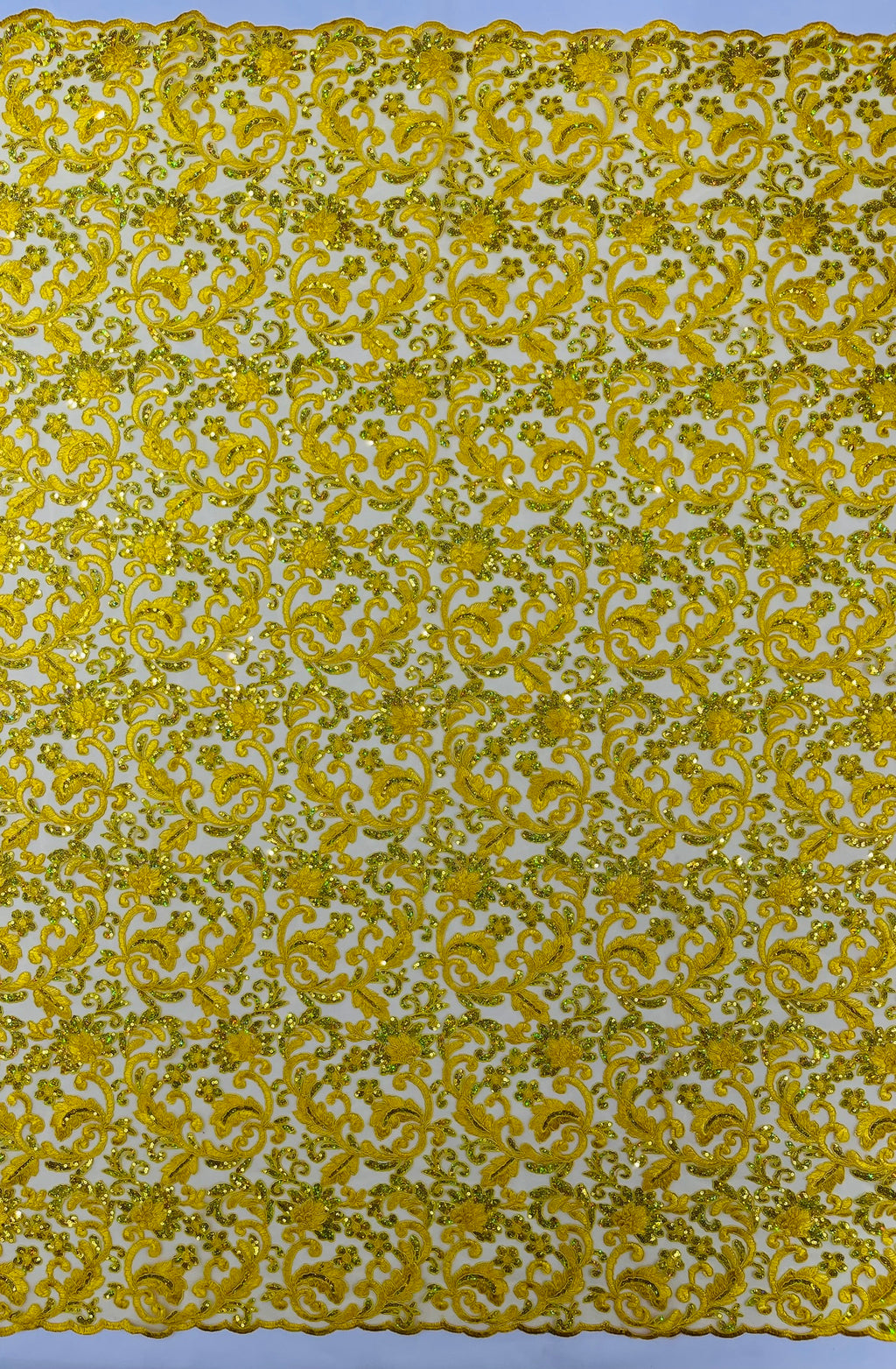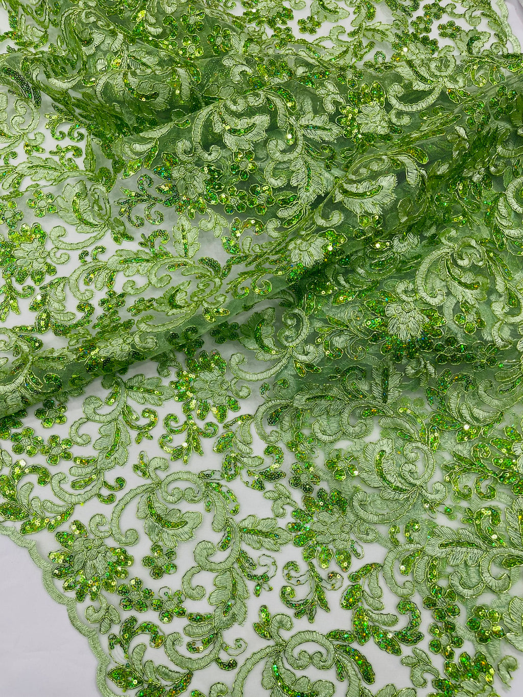 These metallic corded flowers are embroider with holographic sequins on a mesh lace fabric giving off a sophisticated and elegant look . The lace has a double scallops on the width. This lace can be used for dresses, tablecloths, nightgowns, prom gowns, bridal gowns, wedding gowns, runners, Vegas shows, pillows, decoration, and much more.
