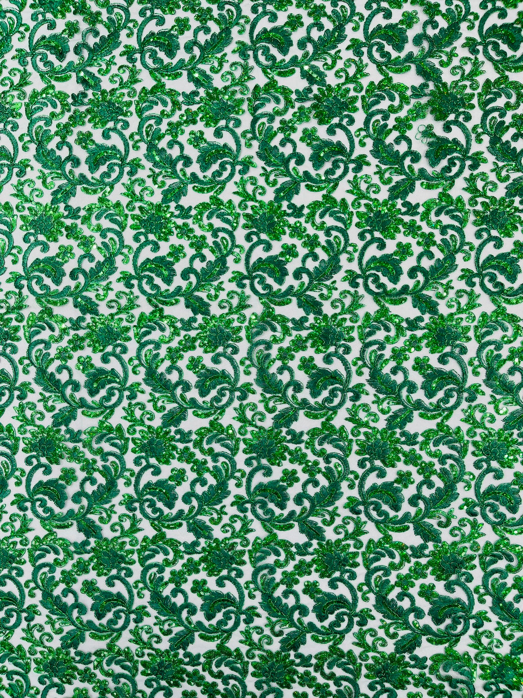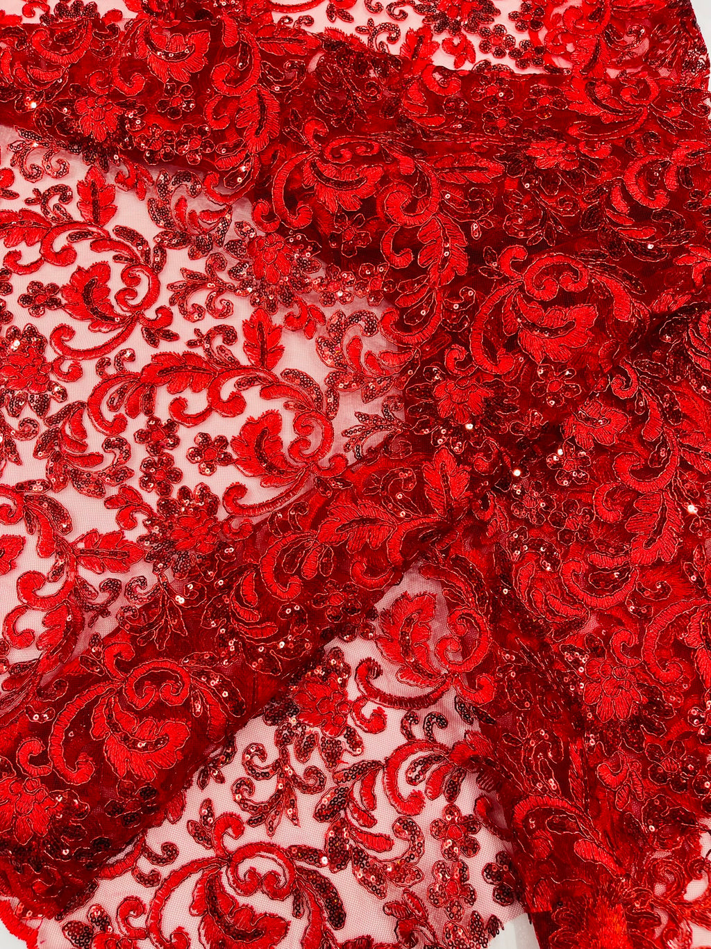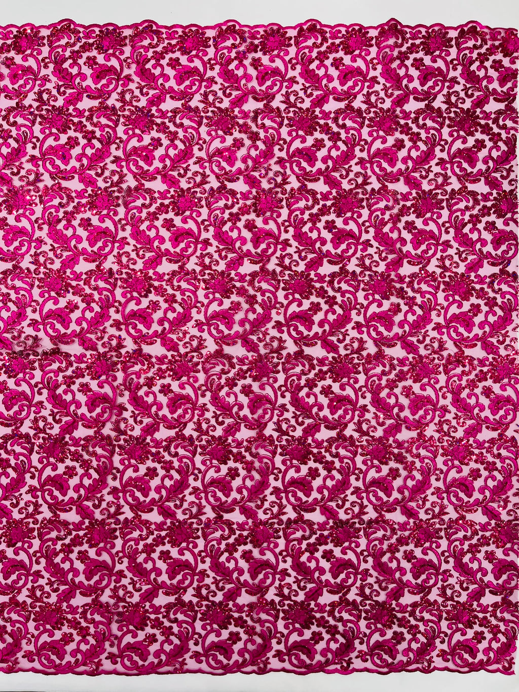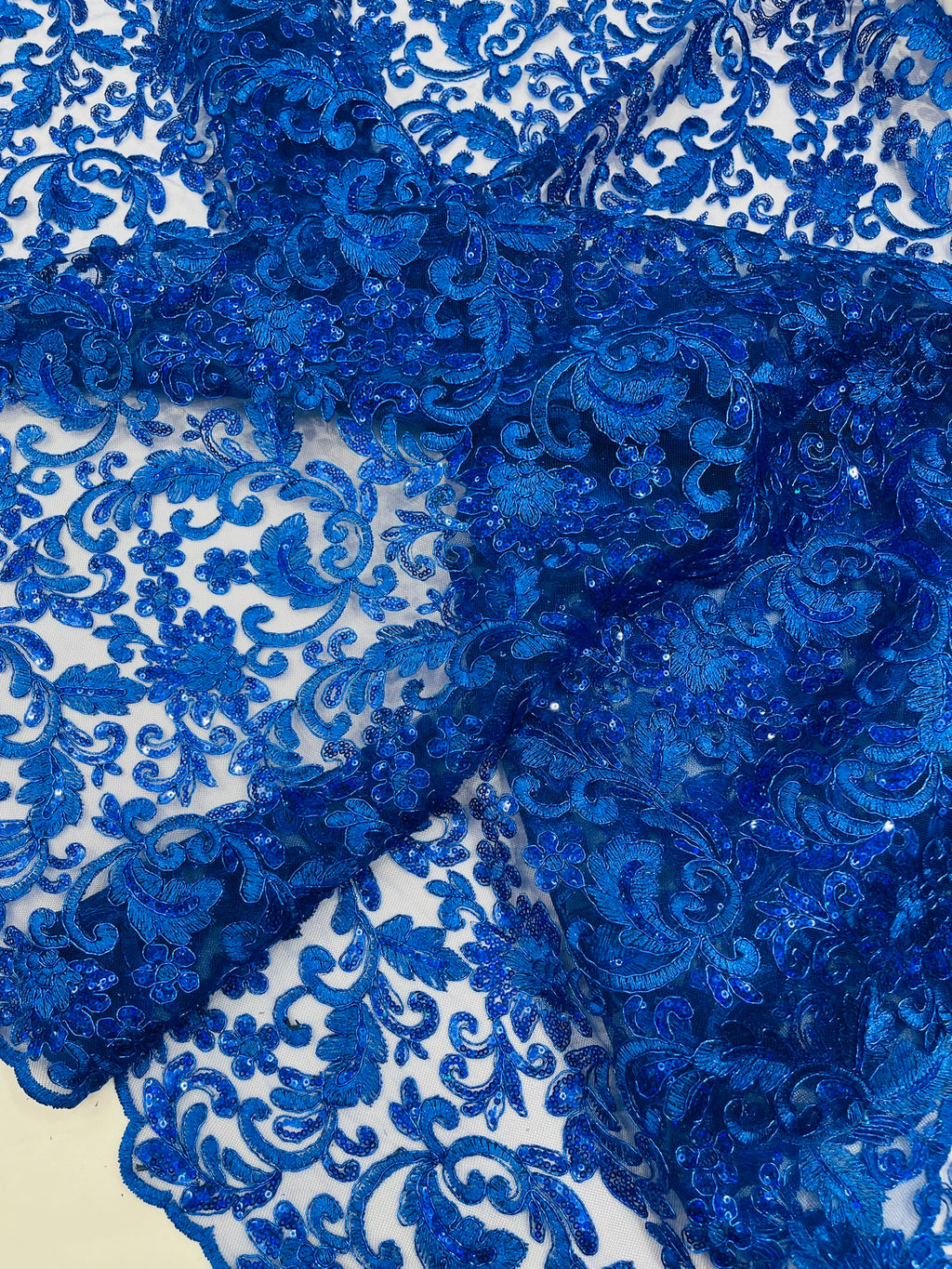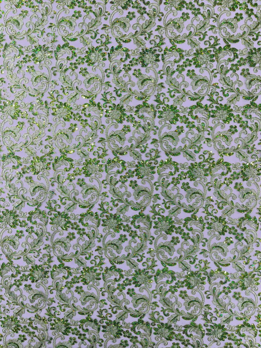 These metallic corded flowers are embroider with holographic sequins on a mesh lace fabric giving off a sophisticated and elegant look . The lace has a double scallops on the width. This lace can be used for dresses, tablecloths, nightgowns, prom gowns, bridal gowns, wedding gowns, runners, Vegas shows, pillows, decoration, and much more.