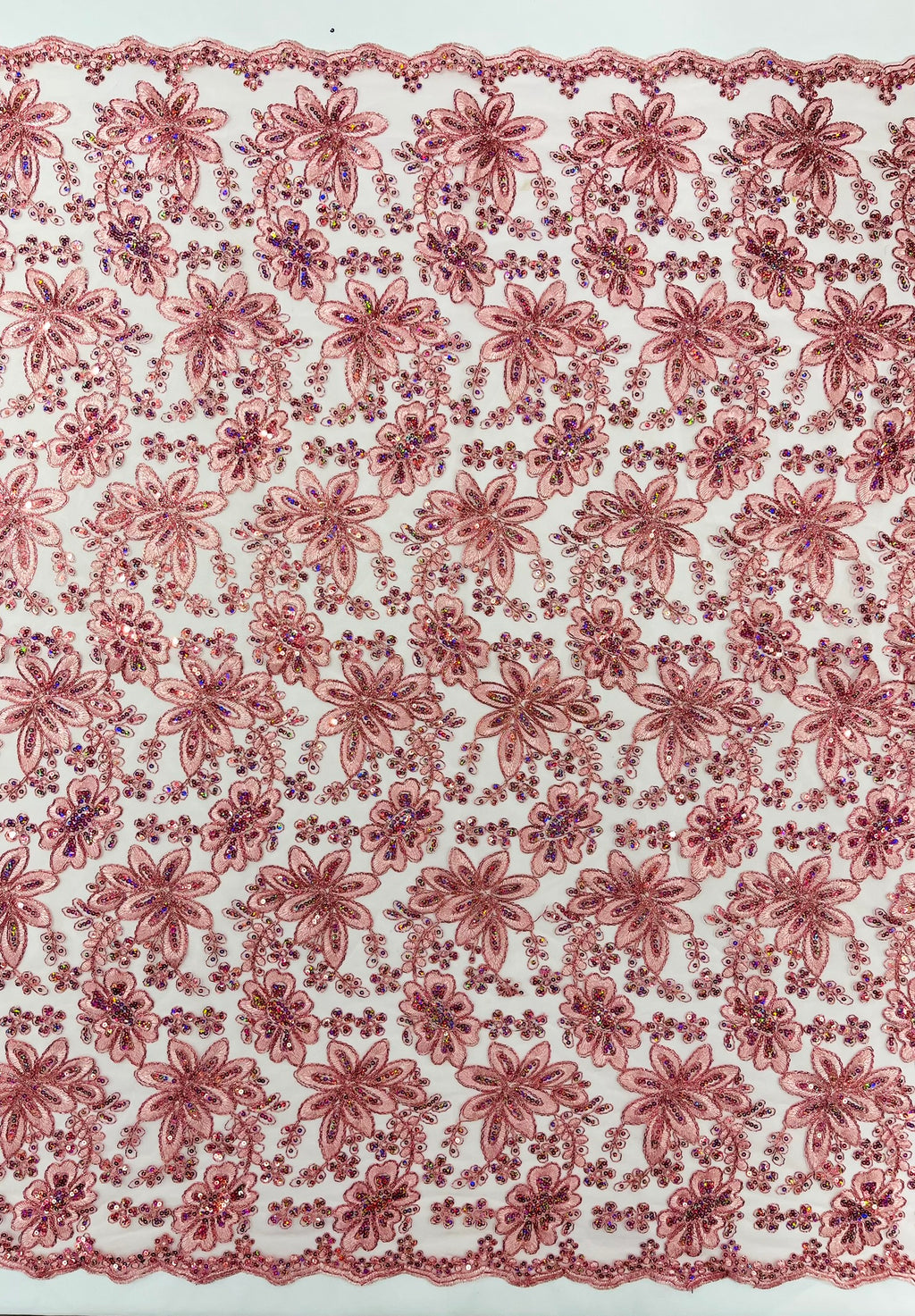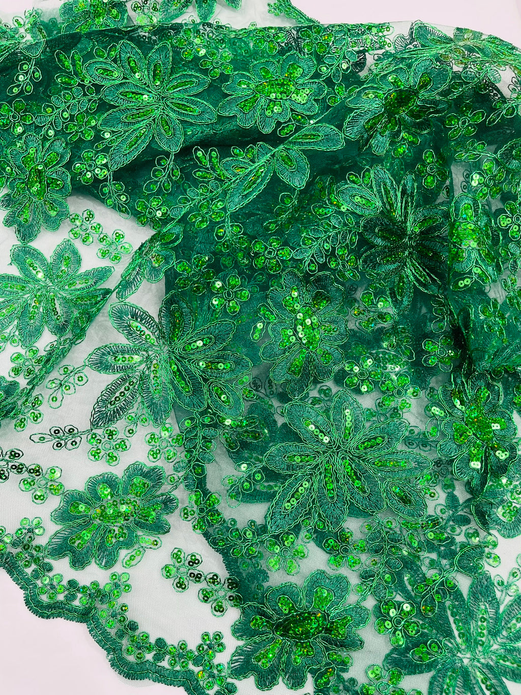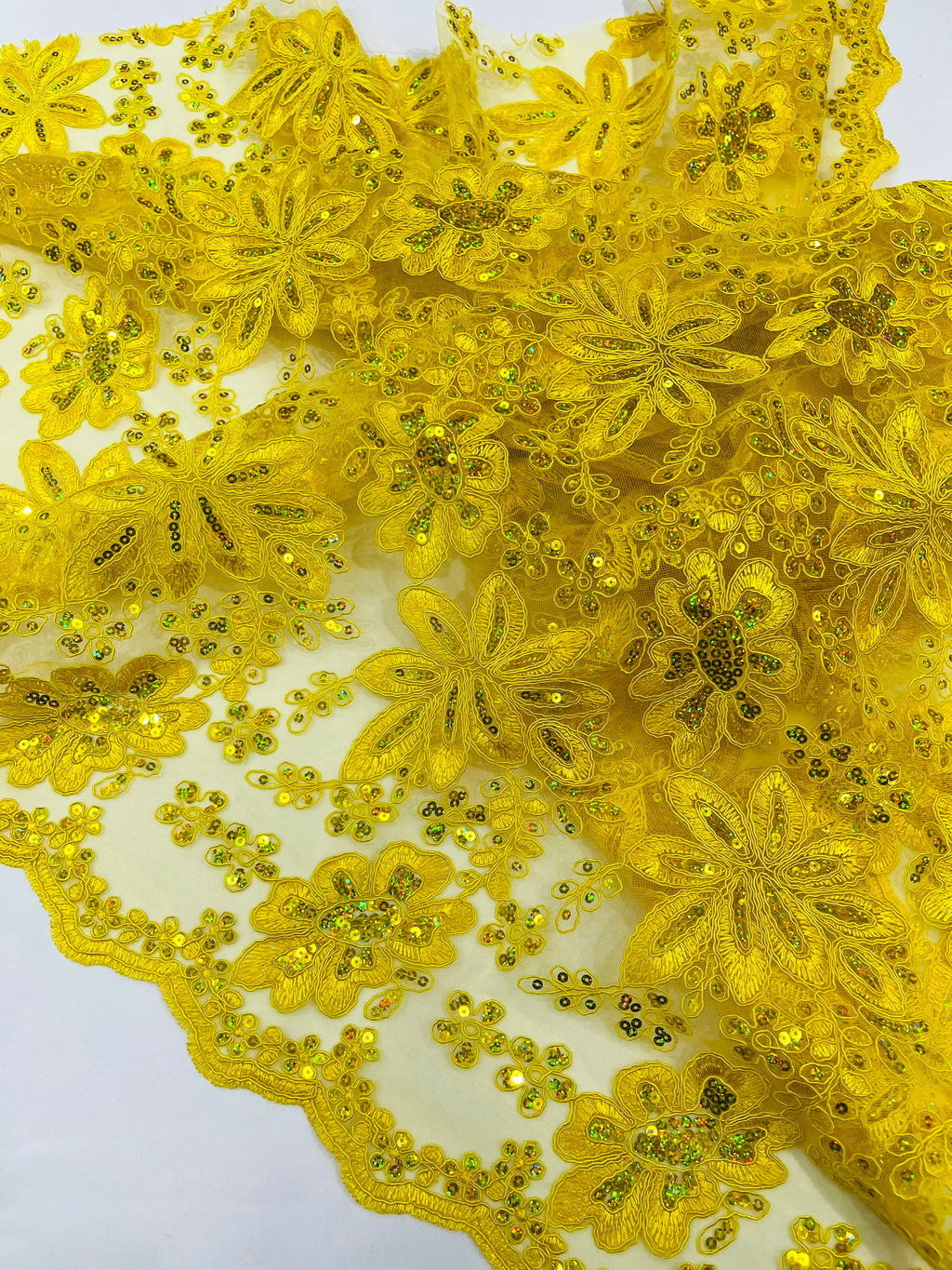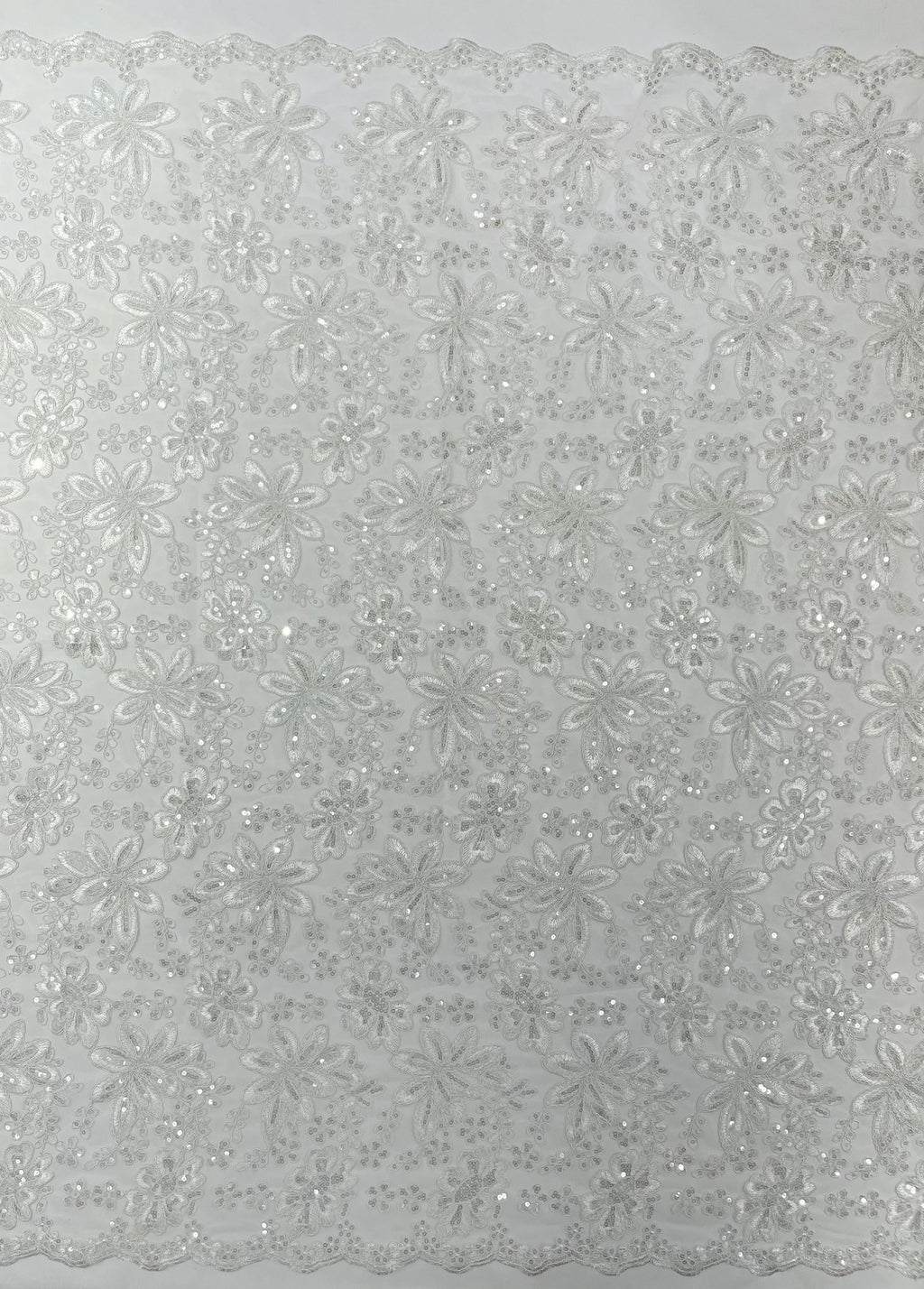 These corded flowers are embroider with sequins on a mesh lace fabric giving off a sophisticated and elegant look . The lace has a double scallops on the width. This lace can be used for dresses, tablecloths, nightgowns, prom gowns, bridal gowns, wedding gowns, runners, Vegas shows, pillows, decoration, and much more.