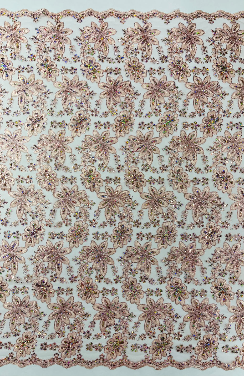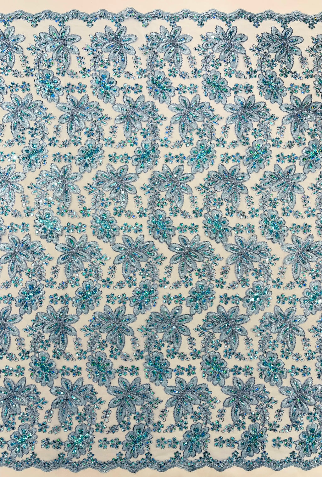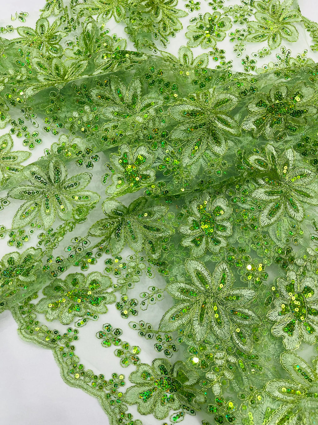 These corded flowers are embroider with sequins on a mesh lace fabric giving off a sophisticated and elegant look . The lace has a double scallops on the width. This lace can be used for dresses, tablecloths, nightgowns, prom gowns, bridal gowns, wedding gowns, runners, Vegas shows, pillows, decoration, and much more.