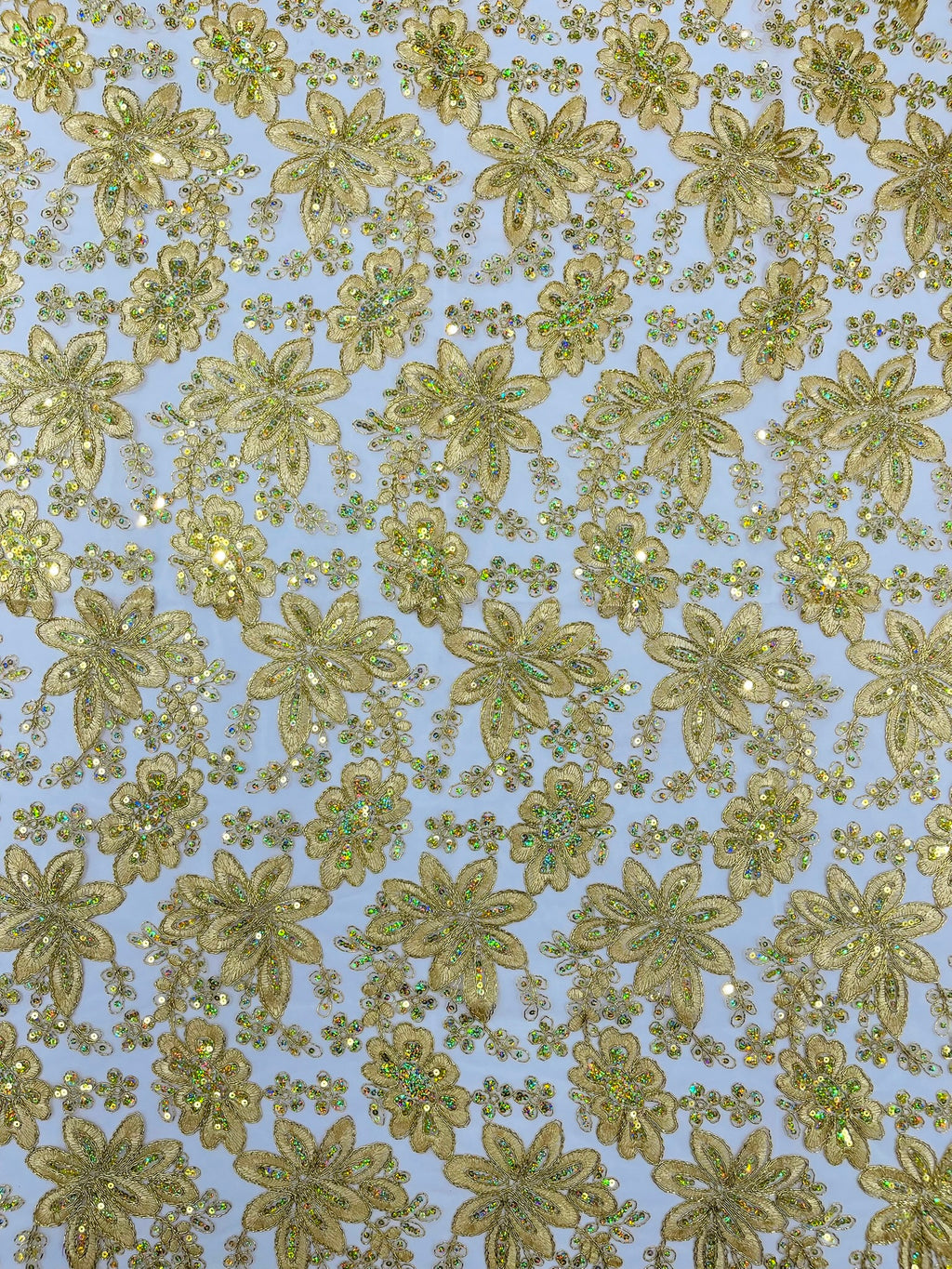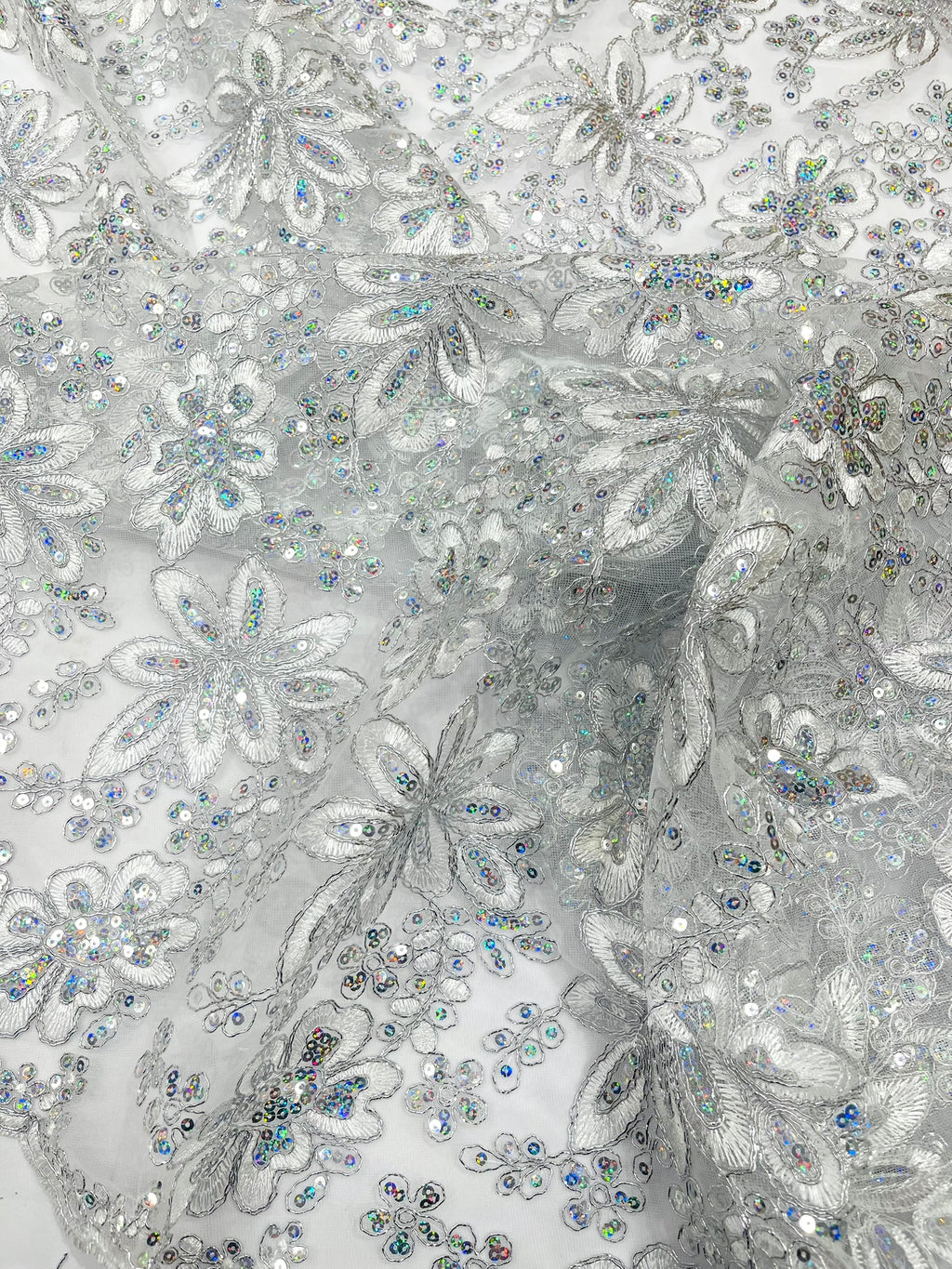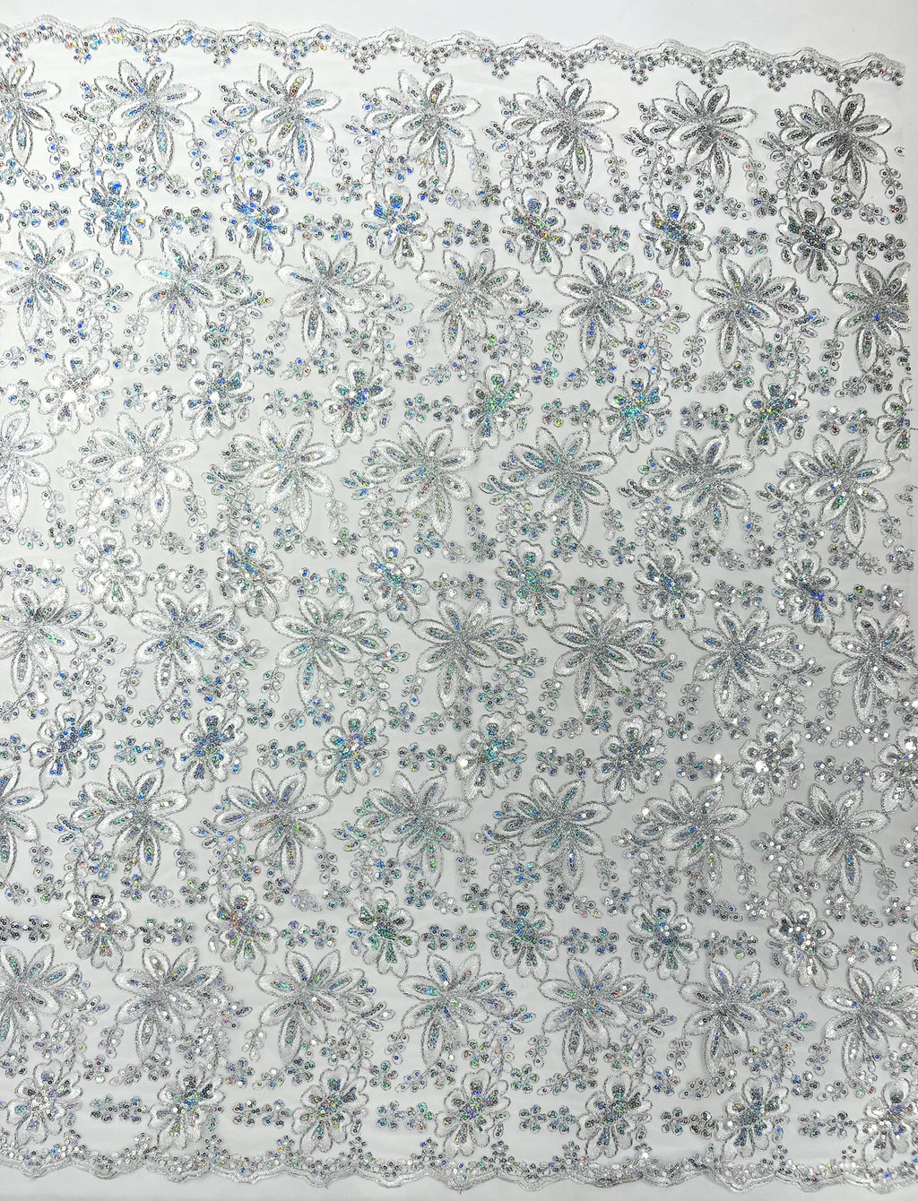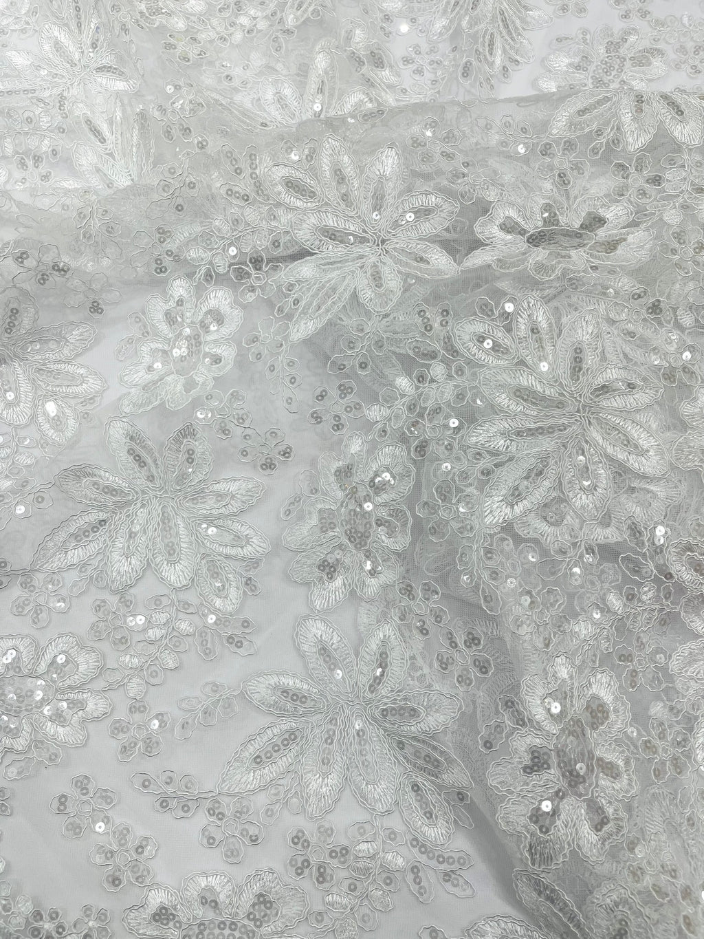 These corded flowers are embroider with sequins on a mesh lace fabric giving off a sophisticated and elegant look . The lace has a double scallops on the width. This lace can be used for dresses, tablecloths, nightgowns, prom gowns, bridal gowns, wedding gowns, runners, Vegas shows, pillows, decoration, and much more.
